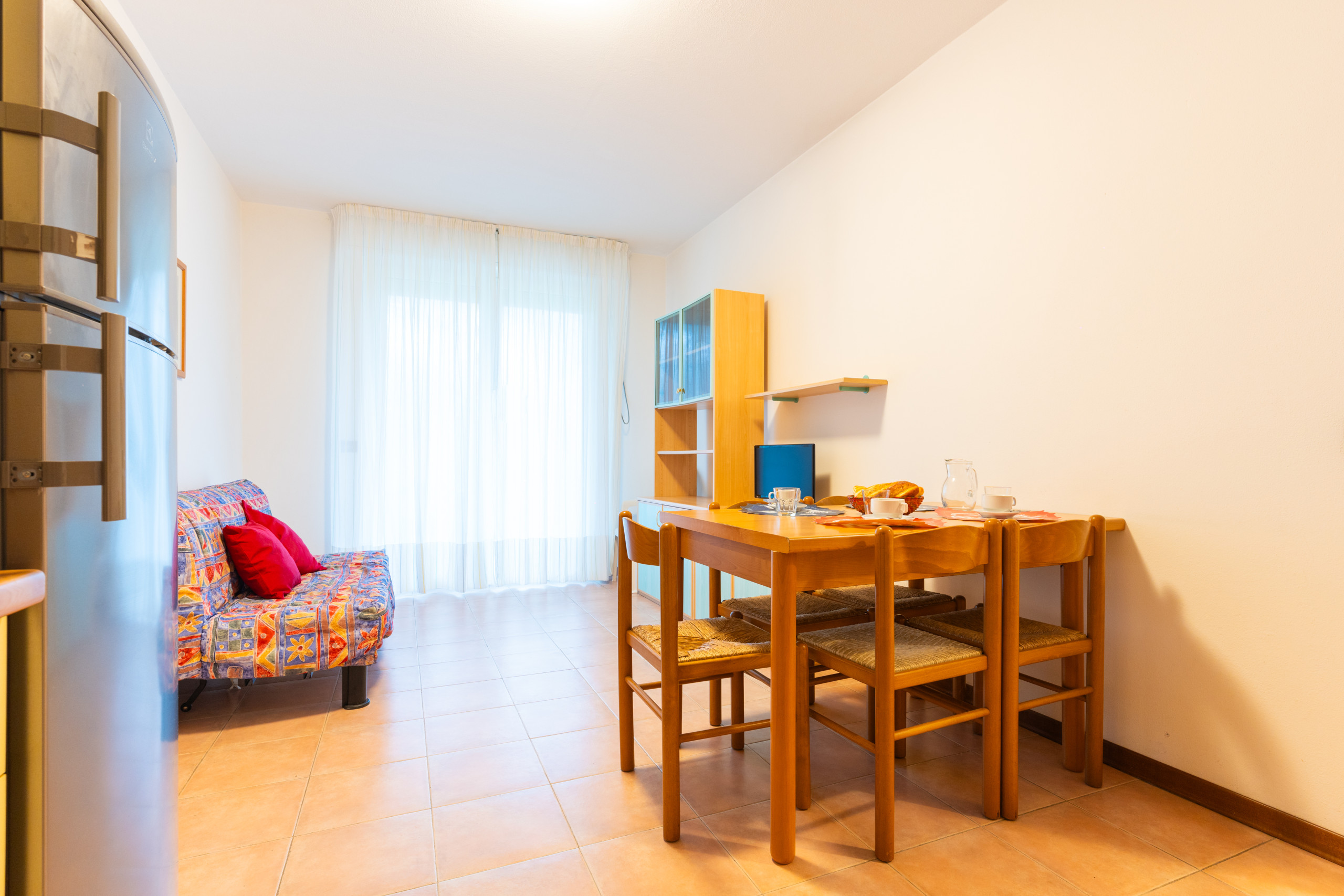 - soggiorno luminoso con angolo cottura attrezzato e divano letto singolo,