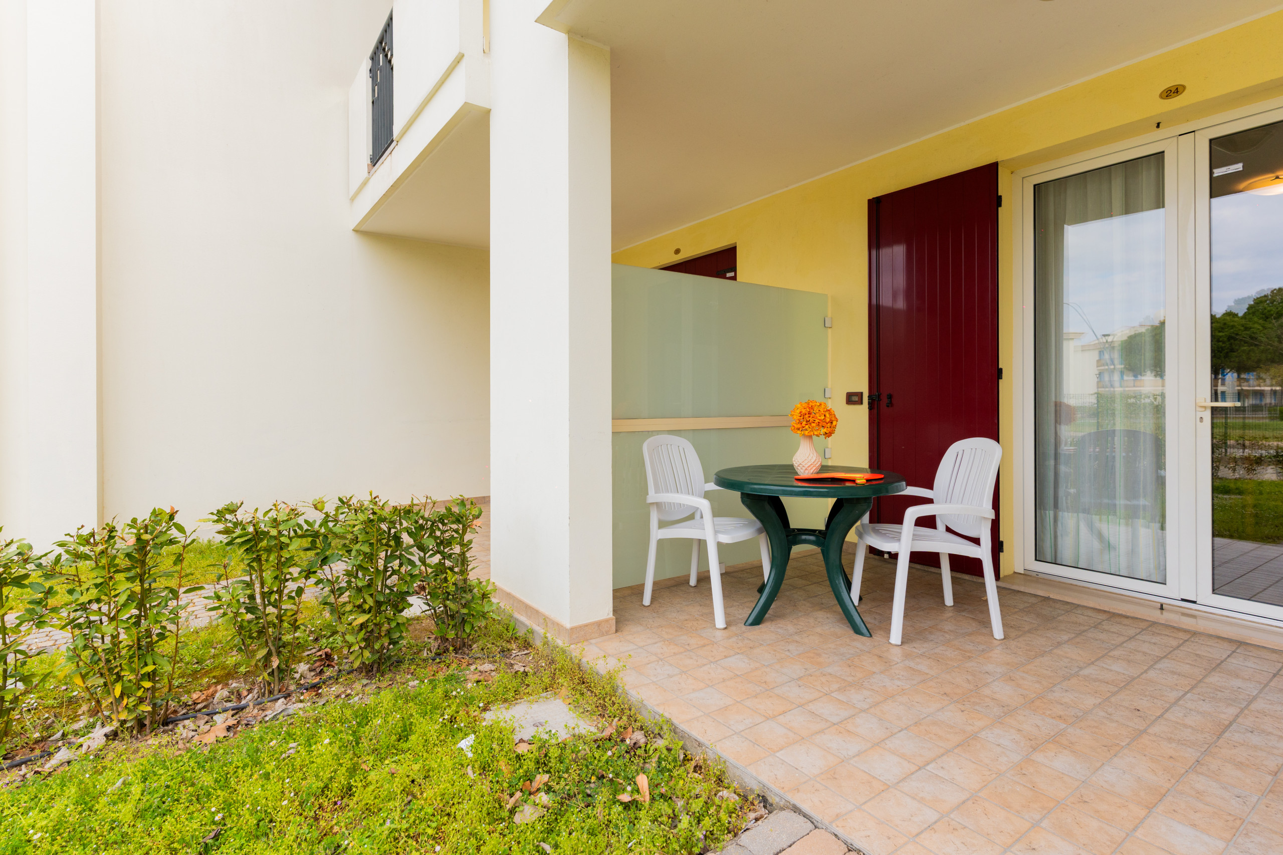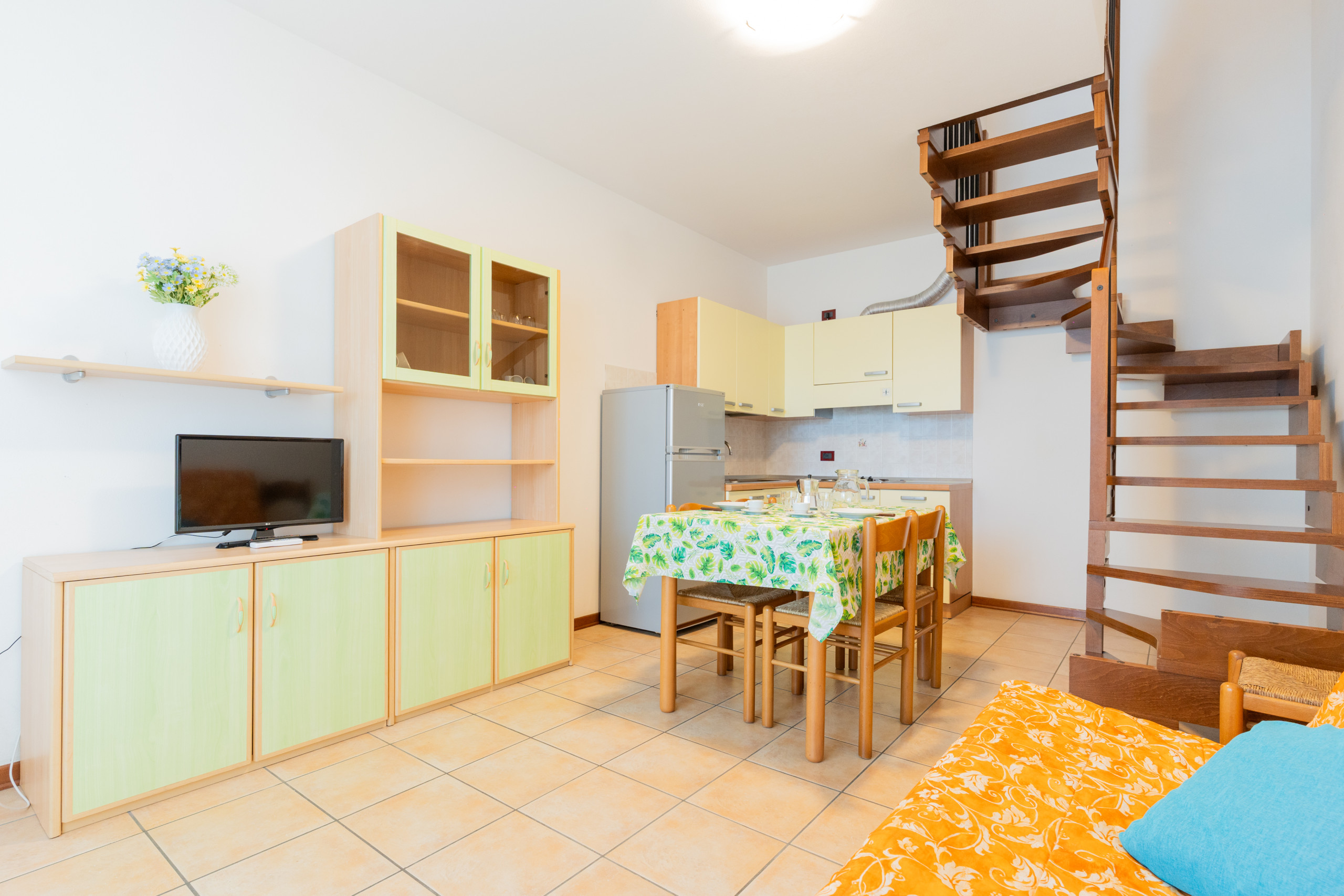 Gli appartamenti bilocali si sviluppano su due piani e offrono spazi accoglienti. Alcune unità dispongono di giardino privato e esterno piastrellato arredato, altre solo di esterno piastrellato arredato con mobili da esterno, perfetto per pranzi e cene all’aperto. Gli affacci in diverse direzioni sul vialetto interno o la piscina regalano atmosfere sempre nuove durante la giornata. Gli interni sono così composti: