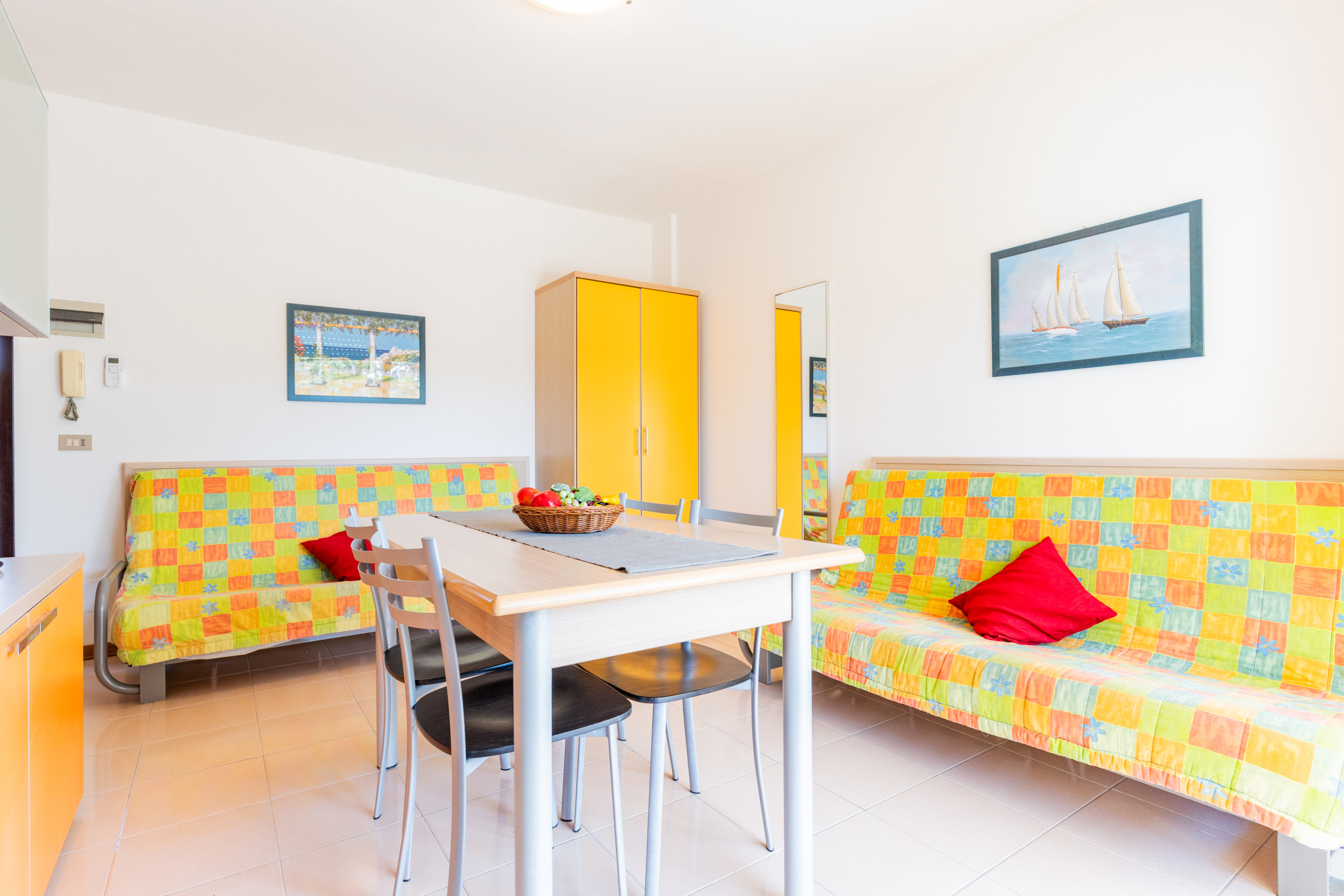 Gli interni sono composti da un soggiorno con angolo cottura attrezzato, divano letto doppio e due poltrone letto singole, oltre a un bagno finestrato con box doccia.