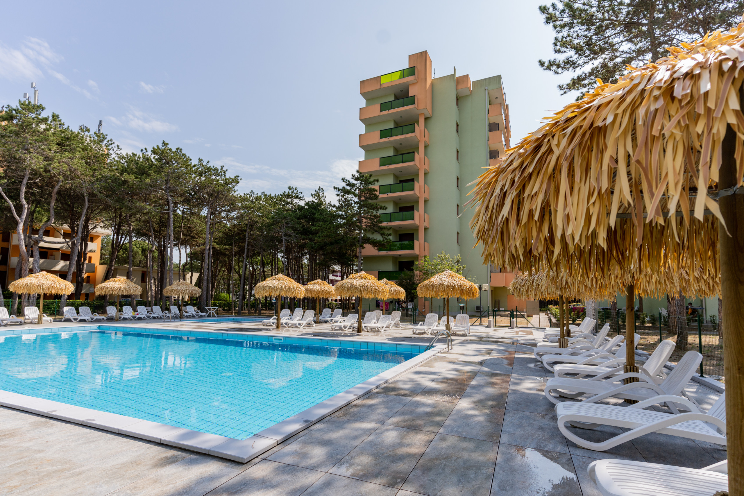La struttura offre una piscina per adulti e una per bambini, perfette per rinfrescarsi nelle giornate estive, oltre alla spiaggia attrezzata con ombrelloni e lettini riservati, inclusi nel prezzo.