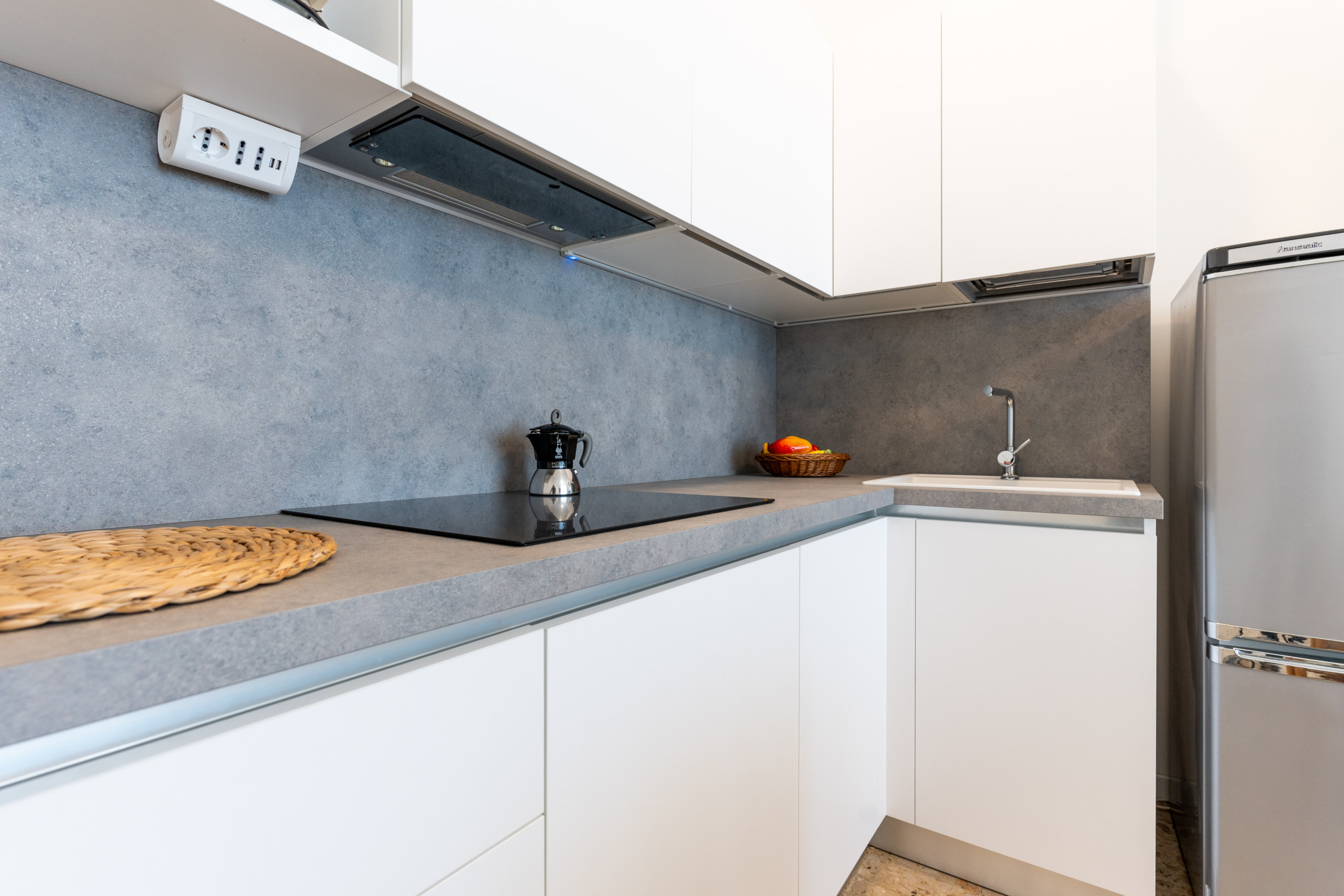 - un soggiorno con angolo cottura moderno dotato di piano a induzione e divano letto doppio