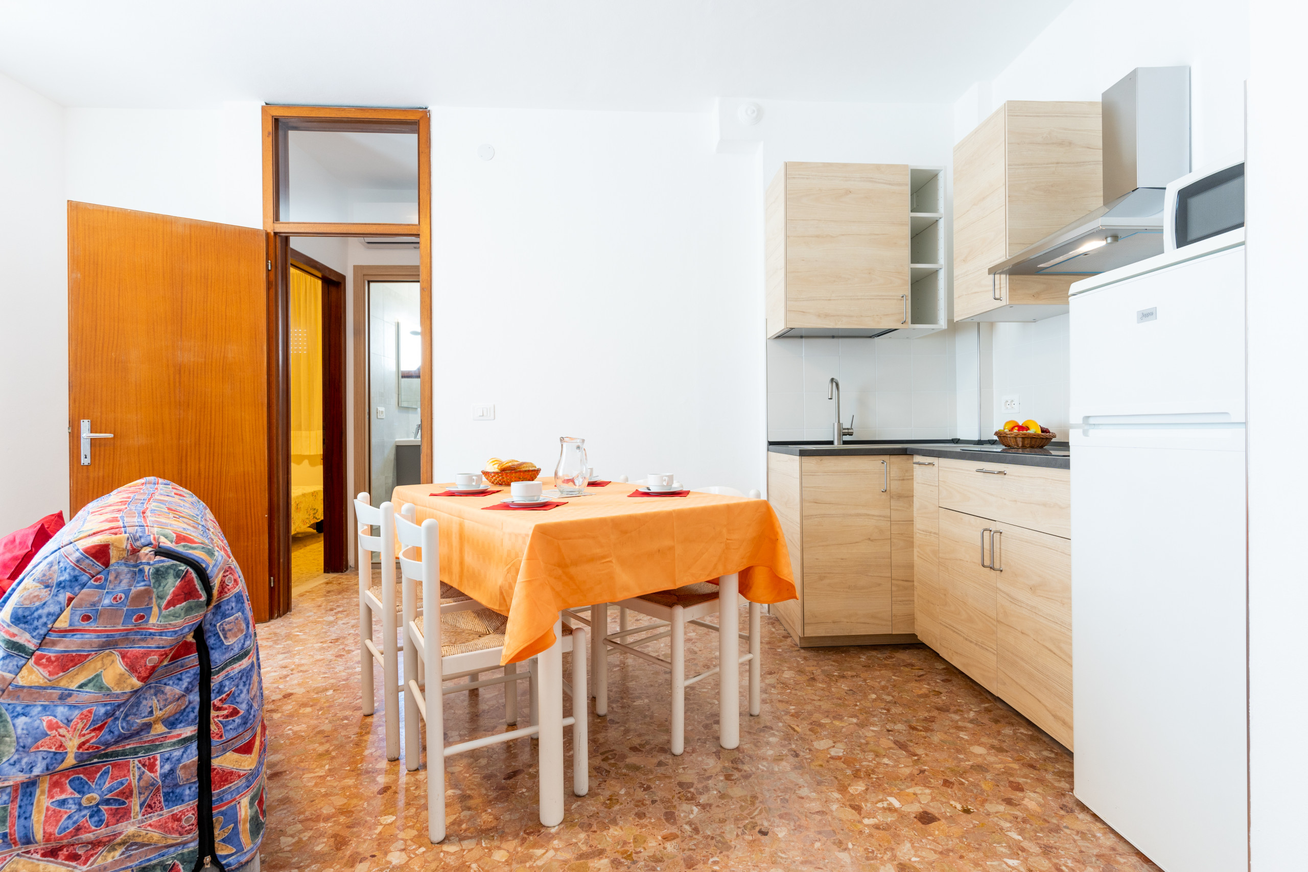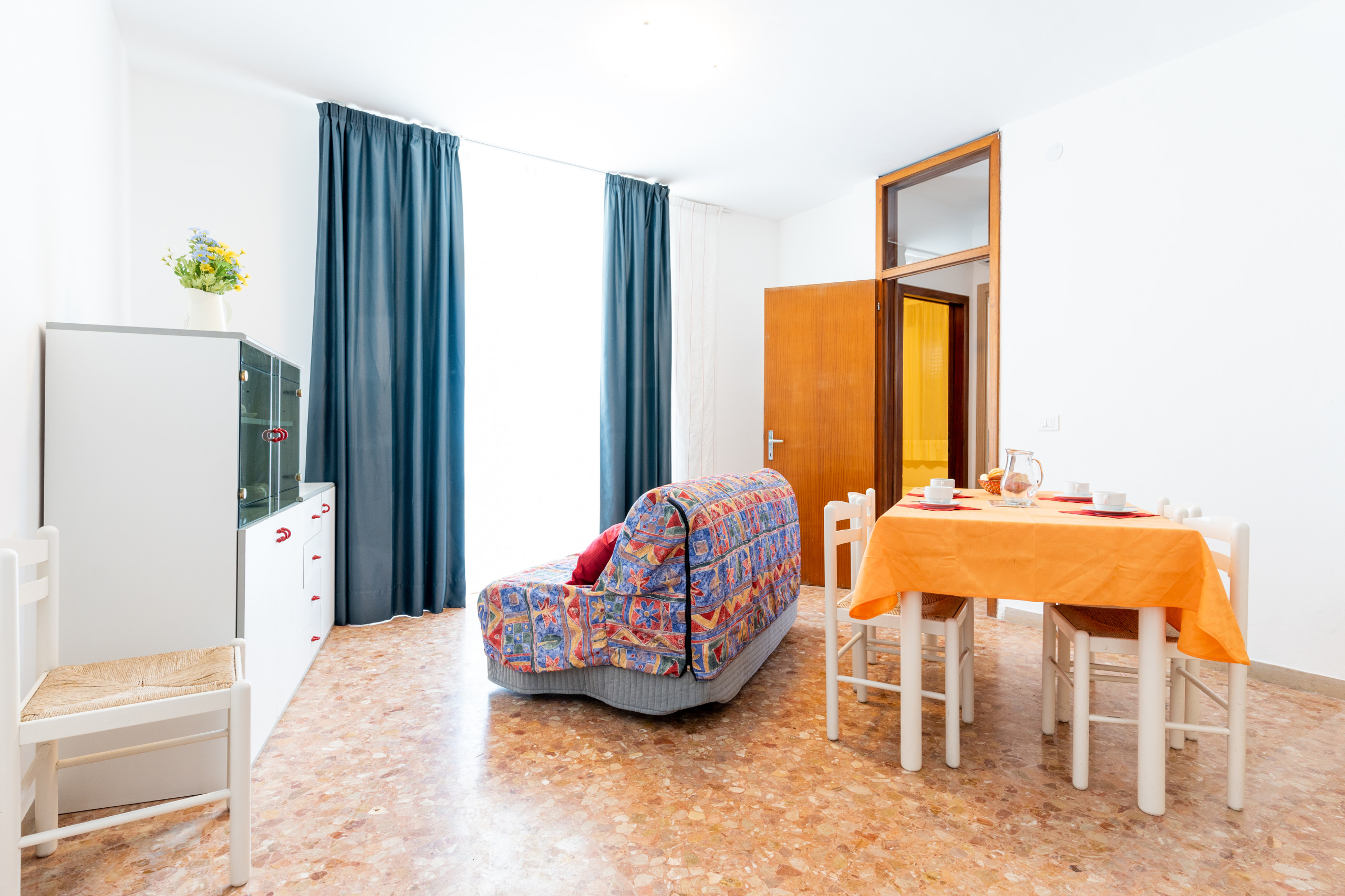 - un luminoso soggiorno con angolo cottura attrezzato e divano letto doppio;