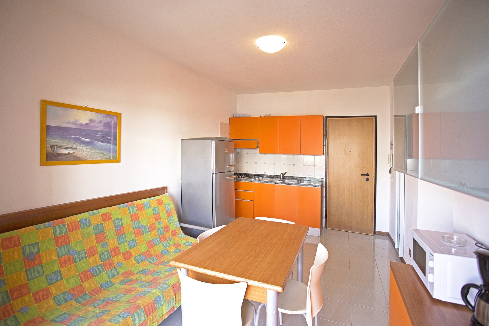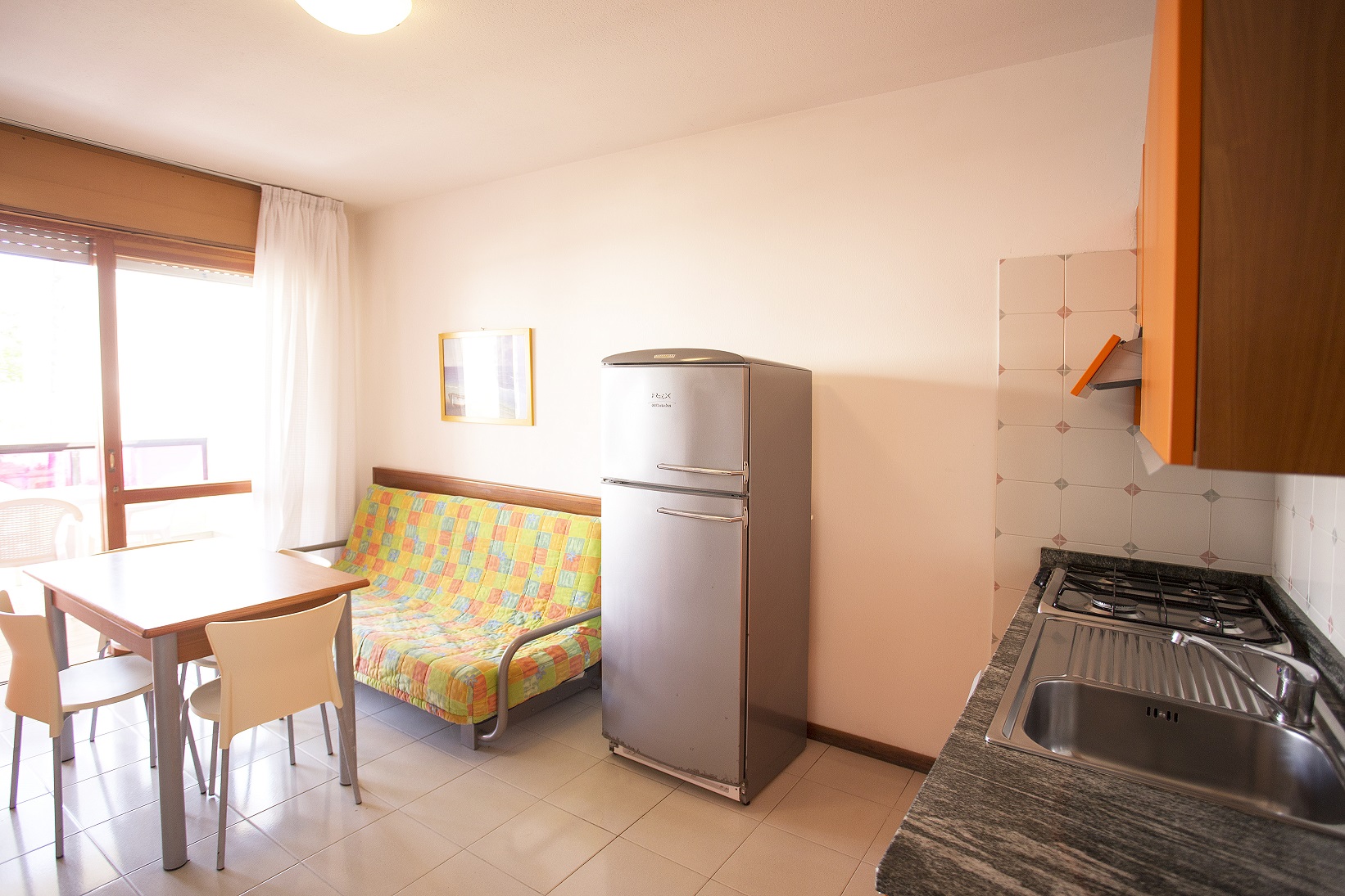 Gli interni sono composti da un soggiorno con angolo cottura attrezzato, divano letto doppio e due poltrone letto singole, oltre a un bagno finestrato con box doccia.