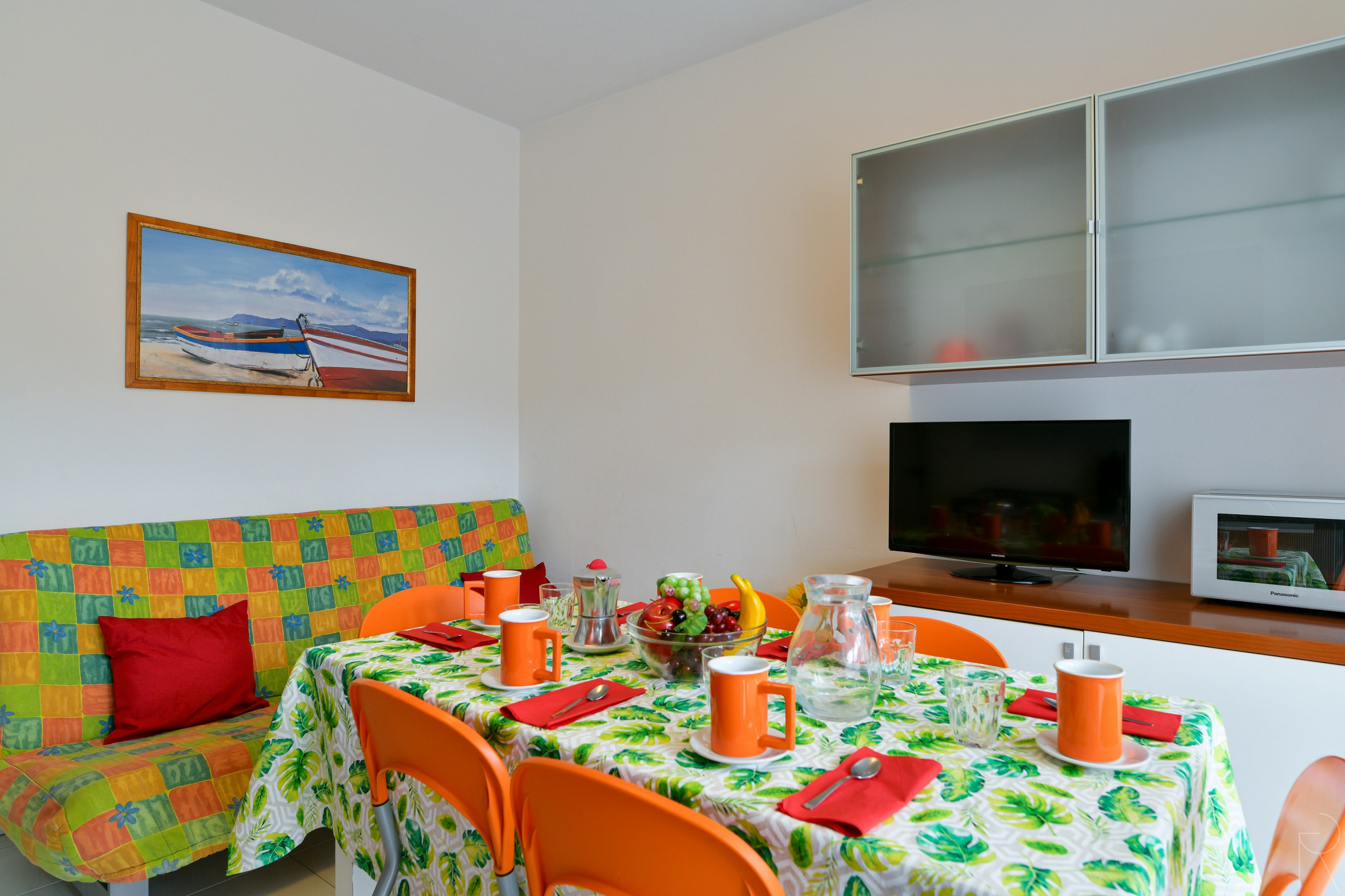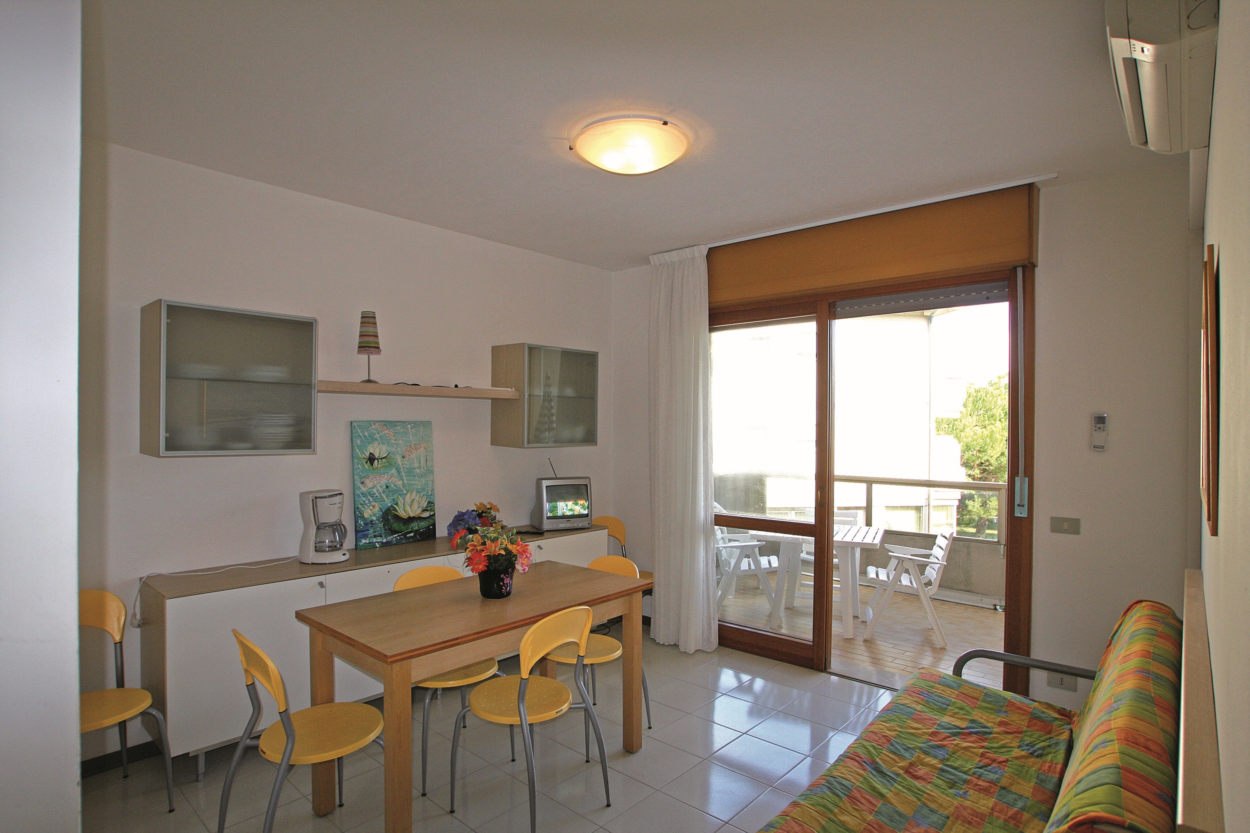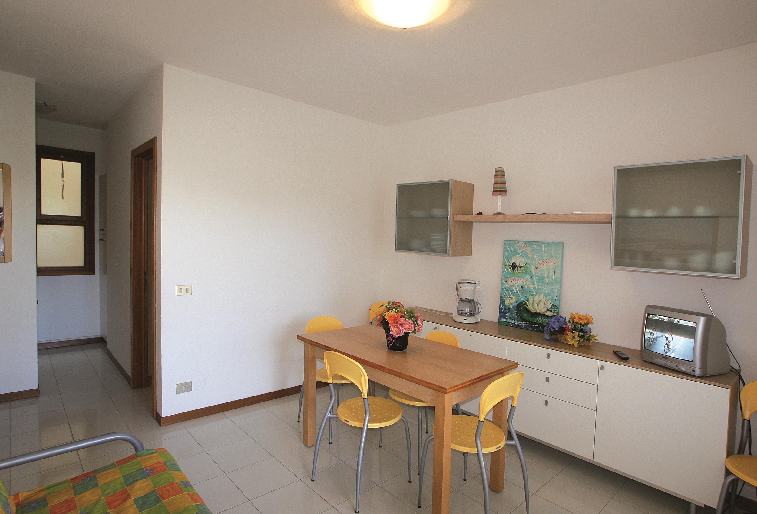 Trilocale con balcone. Composto da soggiorno con angolo cottura e divano letto doppio, camera con letto matrimoniale, camera con due letti singoli e bagno con cabina doccia.