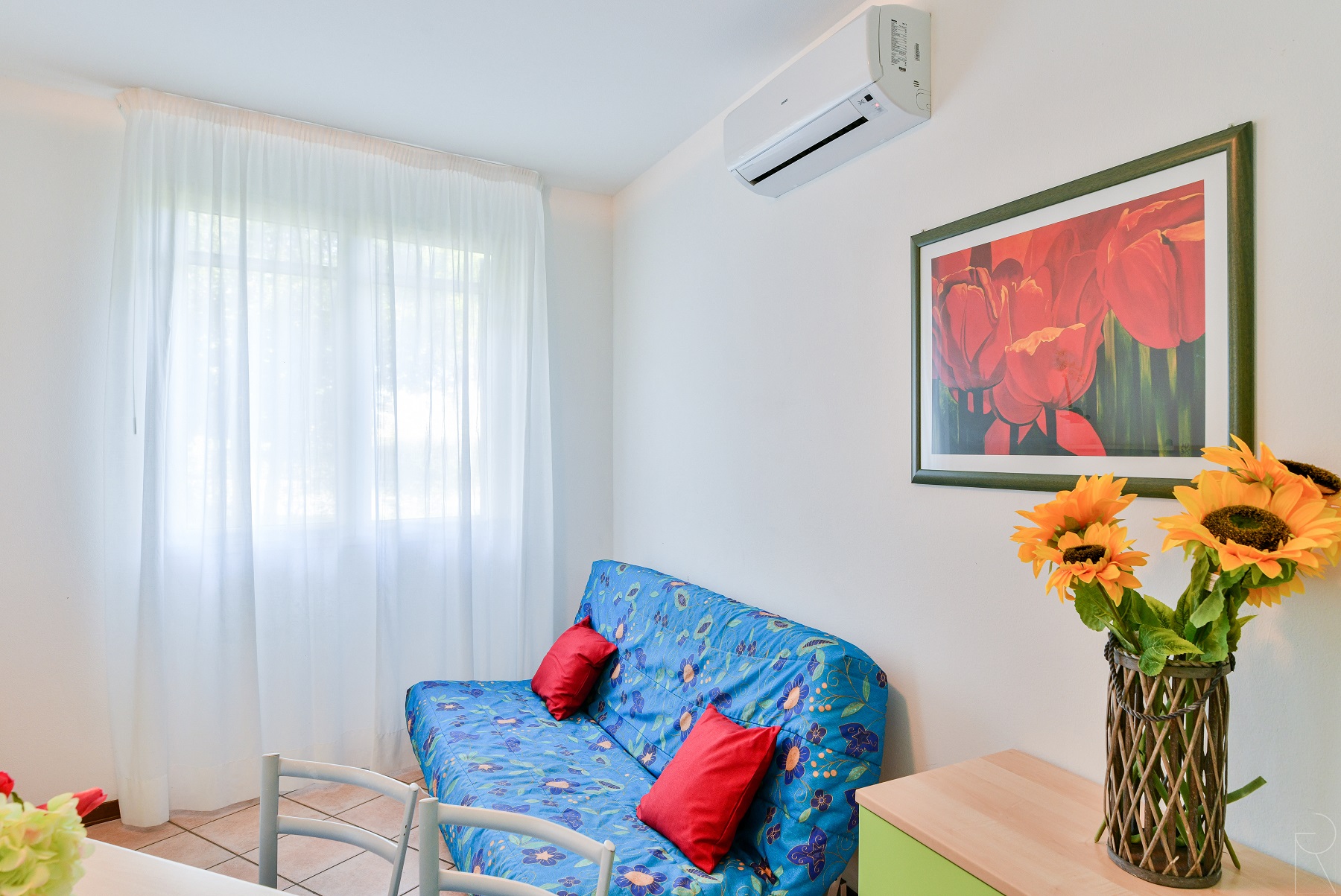 - soggiorno luminoso con angolo cottura attrezzato e divano letto singolo,