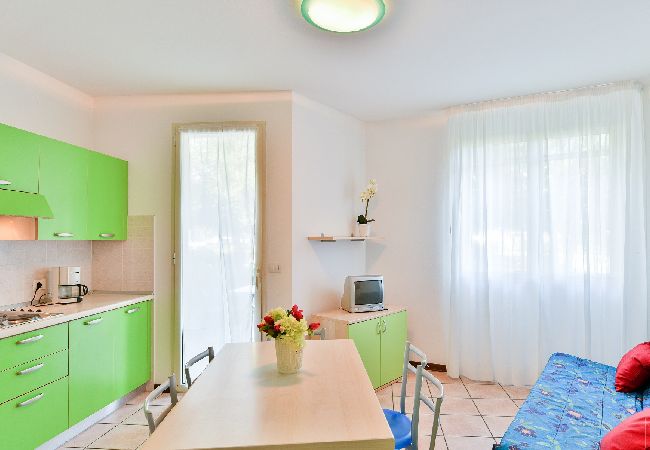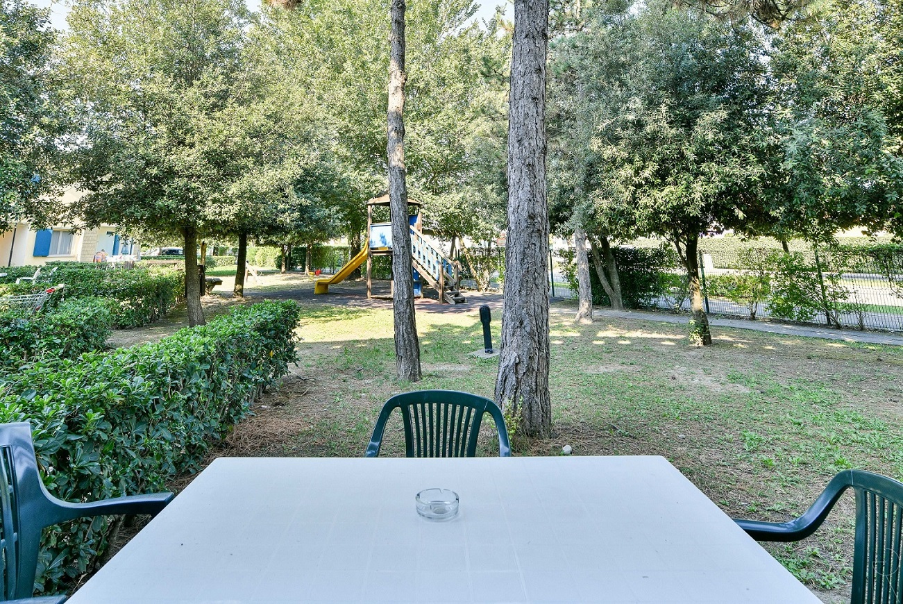 Appartamento bilocale su due piani con giardinetto e balcone. Composto da soggiorno con angolo cottura e divano letto doppio, camera con letto matrimoniale e letto singolo e bagno. Villaggio Girasoli è un villaggio con piscina per adulti e bambini situato a Bibione a circa 500 metri dalla spiaggia. Di recente costruzione è composto da villette a schiera disposte su due piani, arredate in modo confortevole e moderno, quasi tutte con piccolo giardino privato, posto auto coperto in autorimessa o posto auto esterno. Tutte le unità sono fornite di aria condizionata, tv satellitare, caffettiera elettrica, asciugacapelli, cassaforte e frigo a colonna con congelatore. Nel giardino comune si trova un'area giochi per bambini. Servizio spiaggia incluso nel prezzo.
