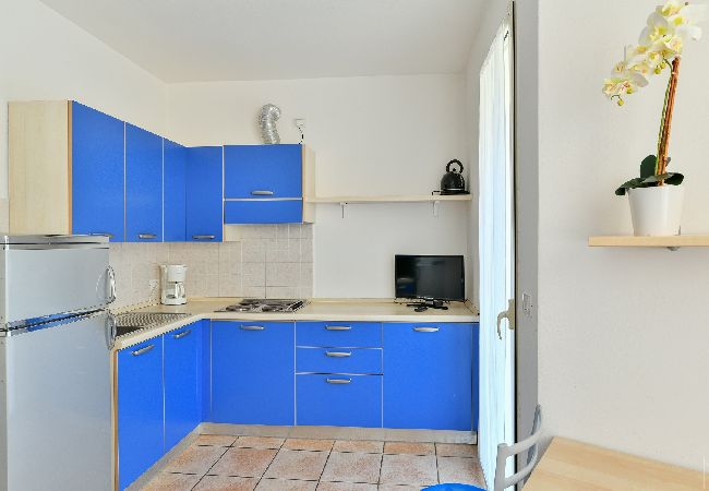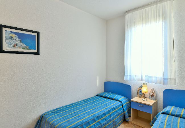 Appartamento trilocale su due piani con giardinetto e balcone. Composto da soggiorno con angolo cottura e divano letto doppio al piano terra con toilette, camera con letto matrimoniale e letto singolo, camera con due letti singoli e bagno al primo piano. Villaggio Girasoli è un villaggio con piscina per adulti e bambini situato a Bibione a circa 500 metri dalla spiaggia. Di recente costruzione è composto da villette a schiera disposte su due piani, arredate in modo confortevole e moderno, quasi tutte con piccolo giardino privato, posto auto coperto in autorimessa o posto auto esterno. Tutte le unità sono fornite di aria condizionata, tv satellitare, caffettiera elettrica, asciugacapelli, cassaforte e frigo a colonna con congelatore. Nel giardino comune si trova un'area giochi per bambini. Servizio spiaggia incluso nel prezzo.