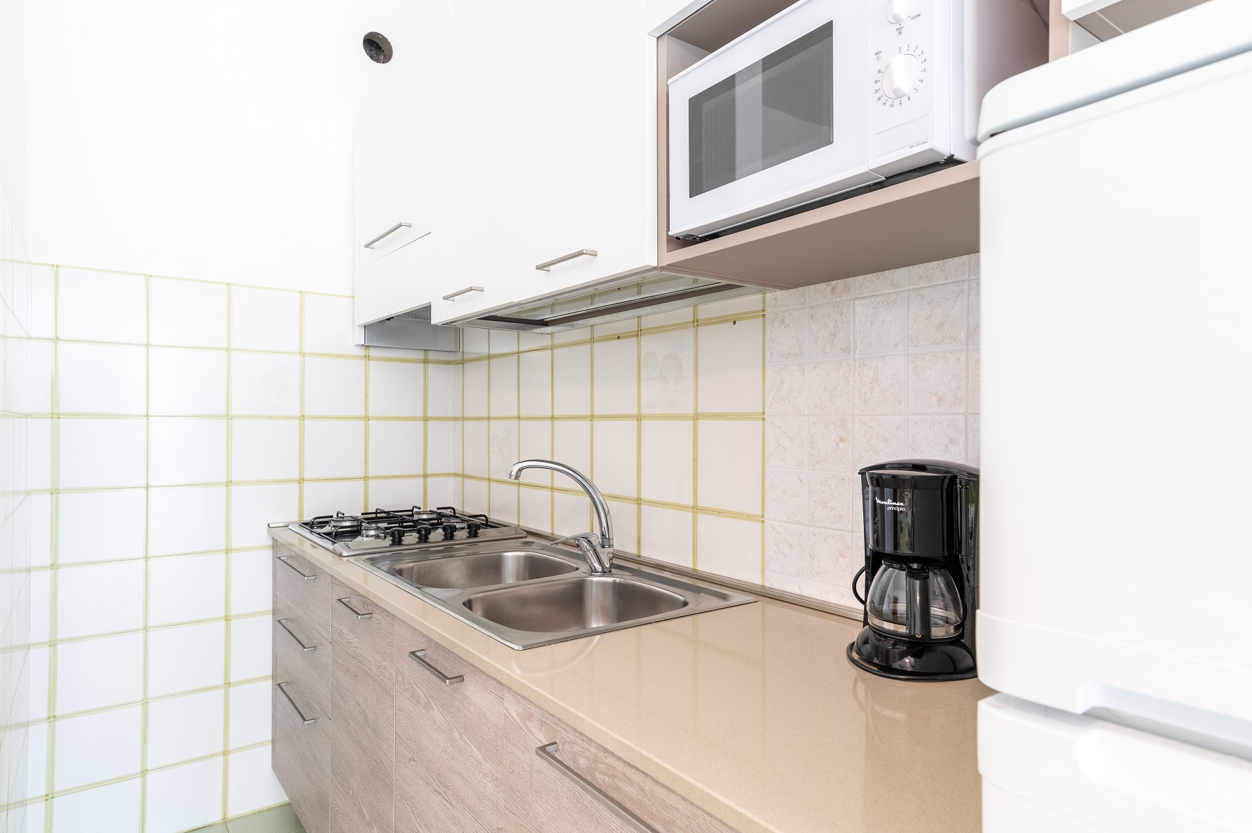 Bilocale composto da soggiorno con angolo cottura e divano letto doppio, camera con letto matrimoniale, bagno e balcone. Sporting Residence 1 è un complesso che si sviluppa in 3 fabbricati, con custode, immerso in un ampio parco. Non lontano dal mare di Bibione Lido del Sole, dotato di piscina e giochi per bambini. Si possono trovare appartamenti tipo bilocale o trilocale, alcuni rinnovati, tutti con aria condizionata e tv-sat. Tutti gli appartamenti dispongono di ampie terrazze e parcheggi numerati scoperti o coperti. Servizio spiaggia incluso nel prezzo.