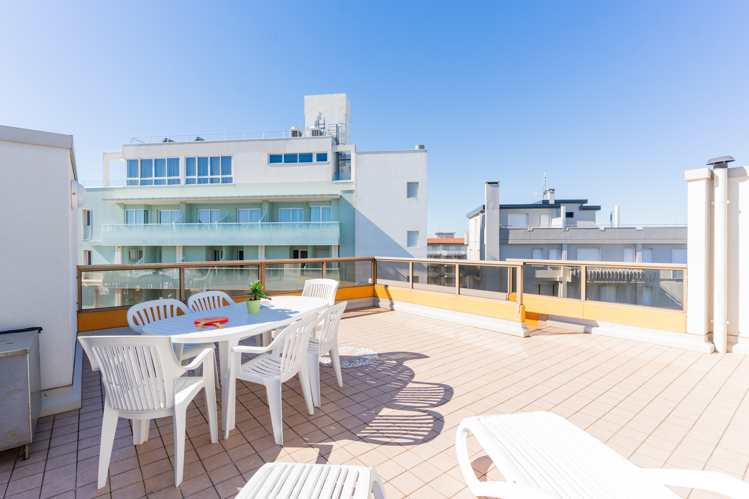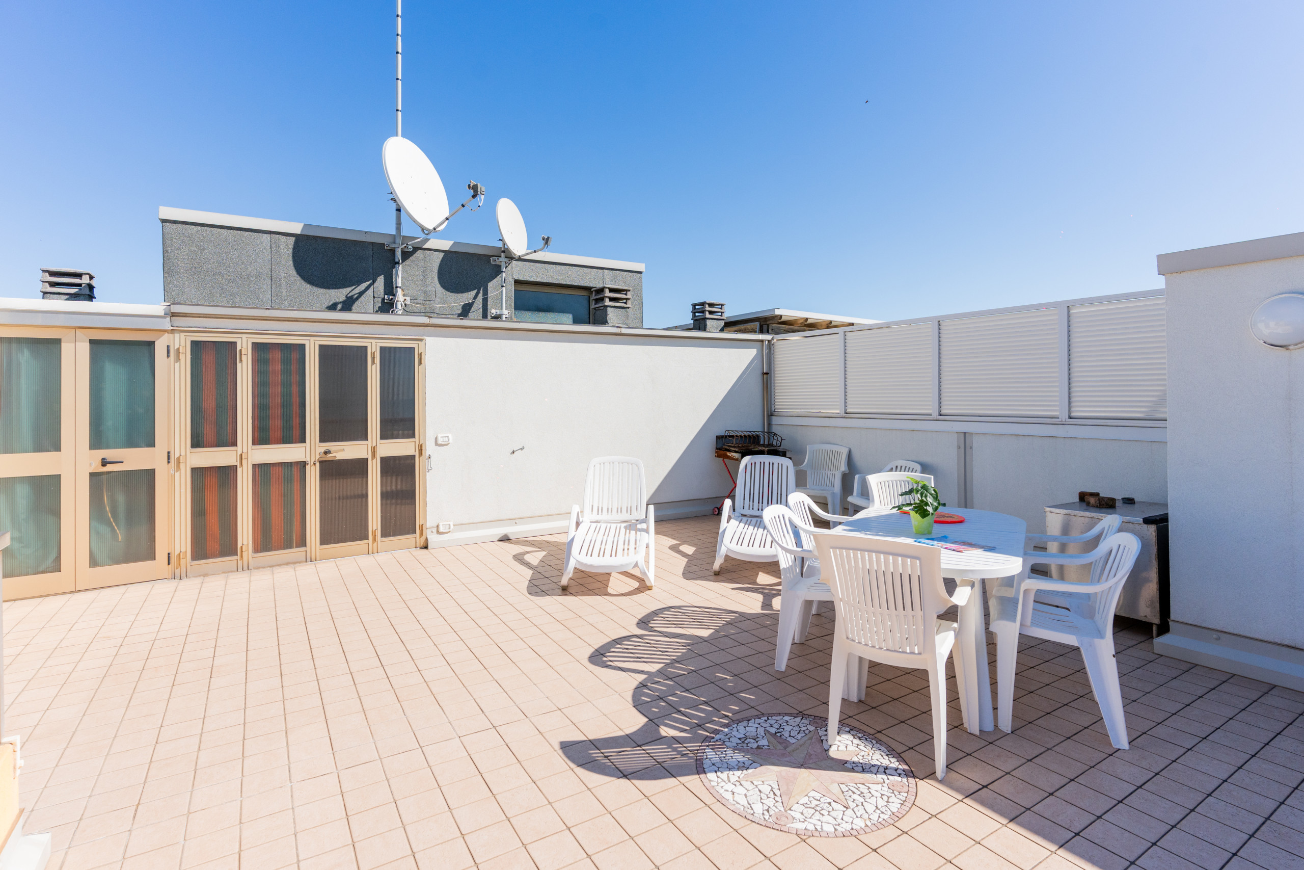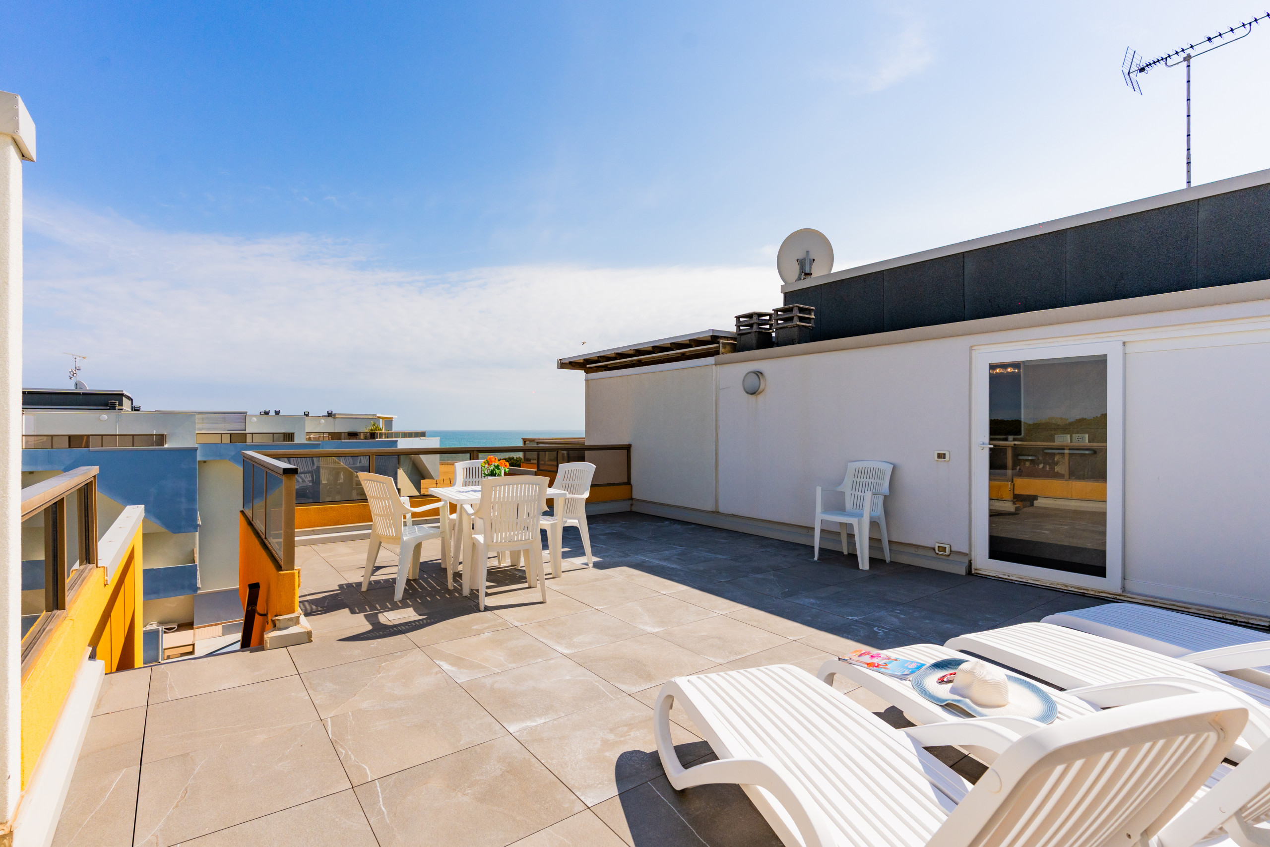 Sul terrazzo attico, dotato di servizi e caminetto, potrai vivere pranzi, cene e momenti di relax con una vista spettacolare sull’Adriatico.