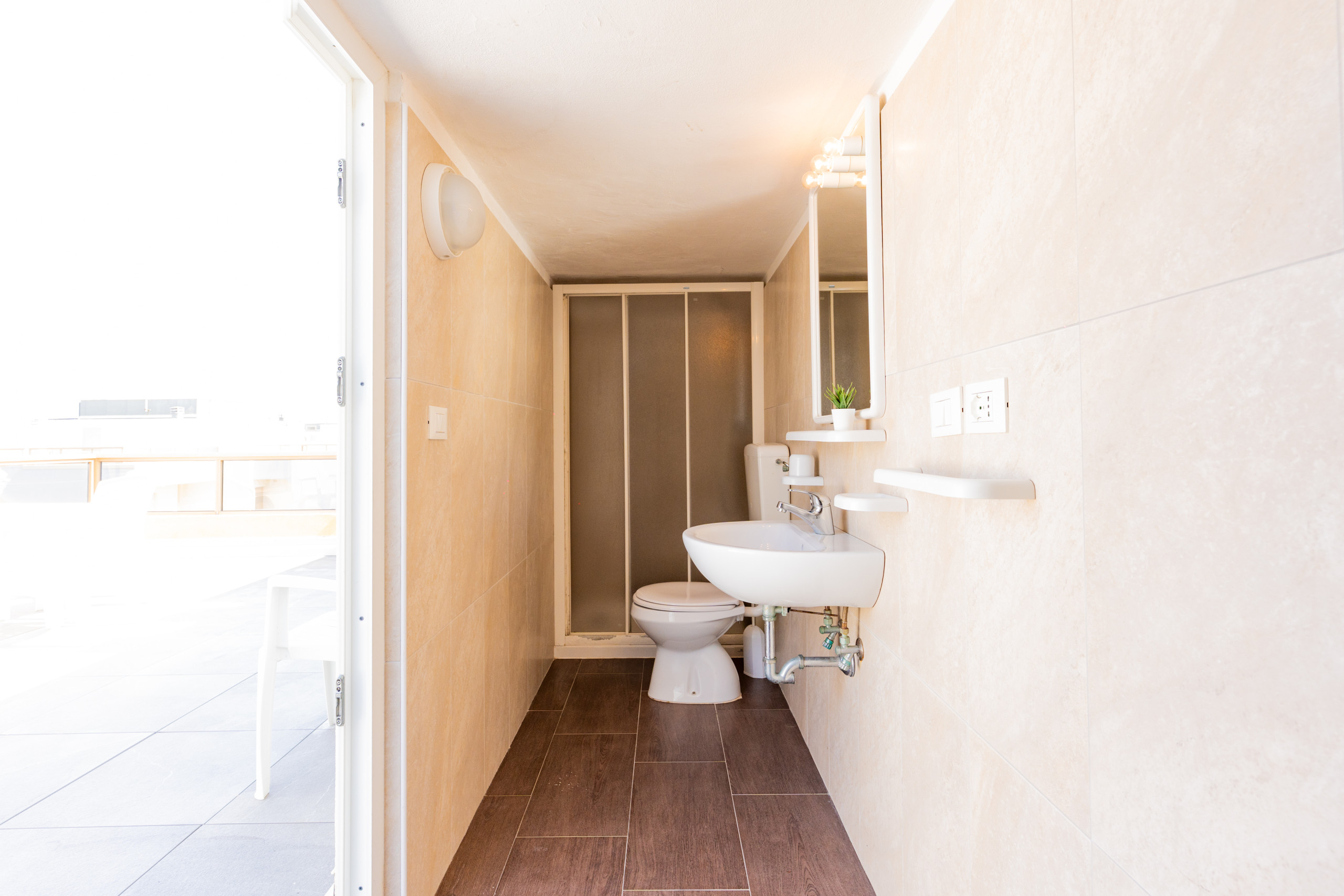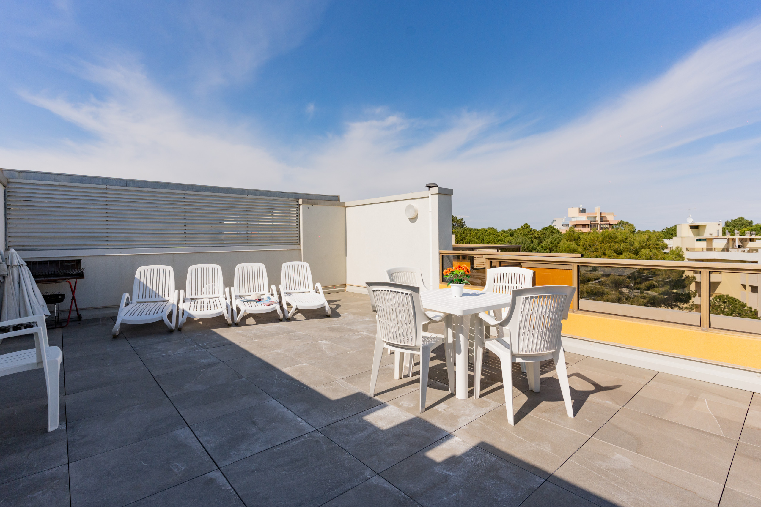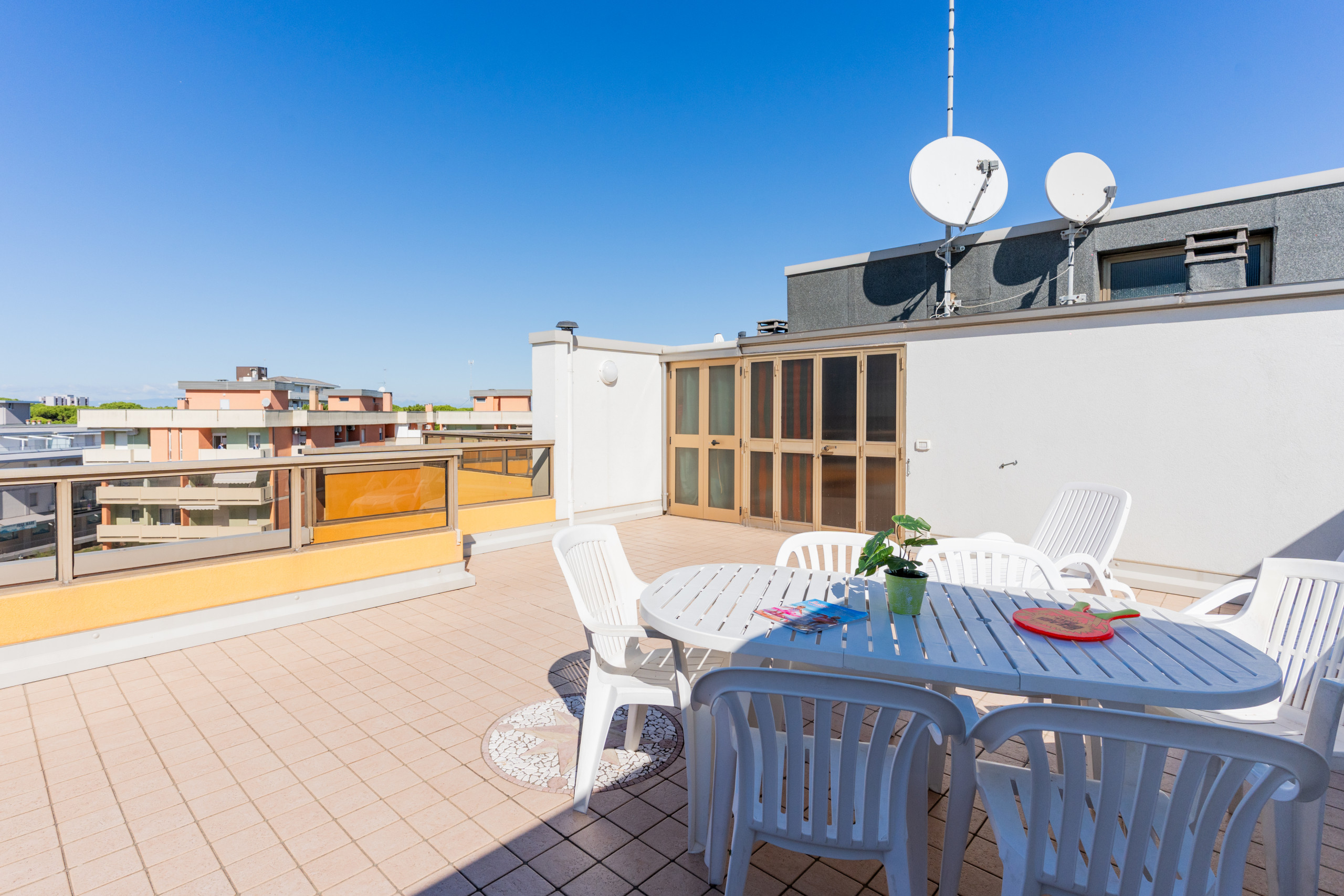 Sul terrazzo attico, dotato di servizi e caminetto, potrai vivere pranzi, cene e momenti di relax con una vista spettacolare sull’Adriatico.