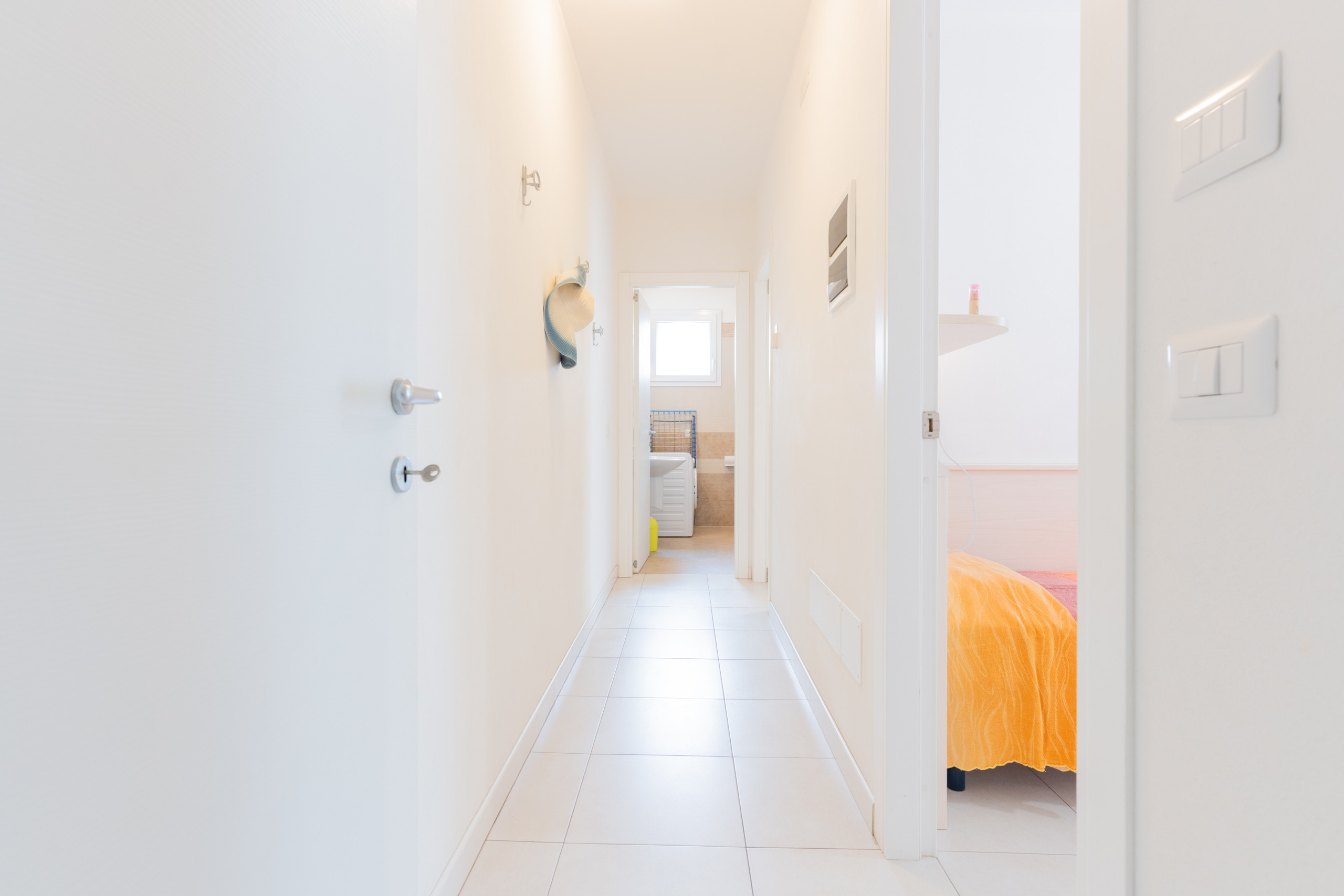 L’appartamento, situato al secondo piano, dispone di un terrazzo esposto a ovest, ideale per rilassarsi al tramonto o gustare la cena all’aperto. All’interno si trovano: