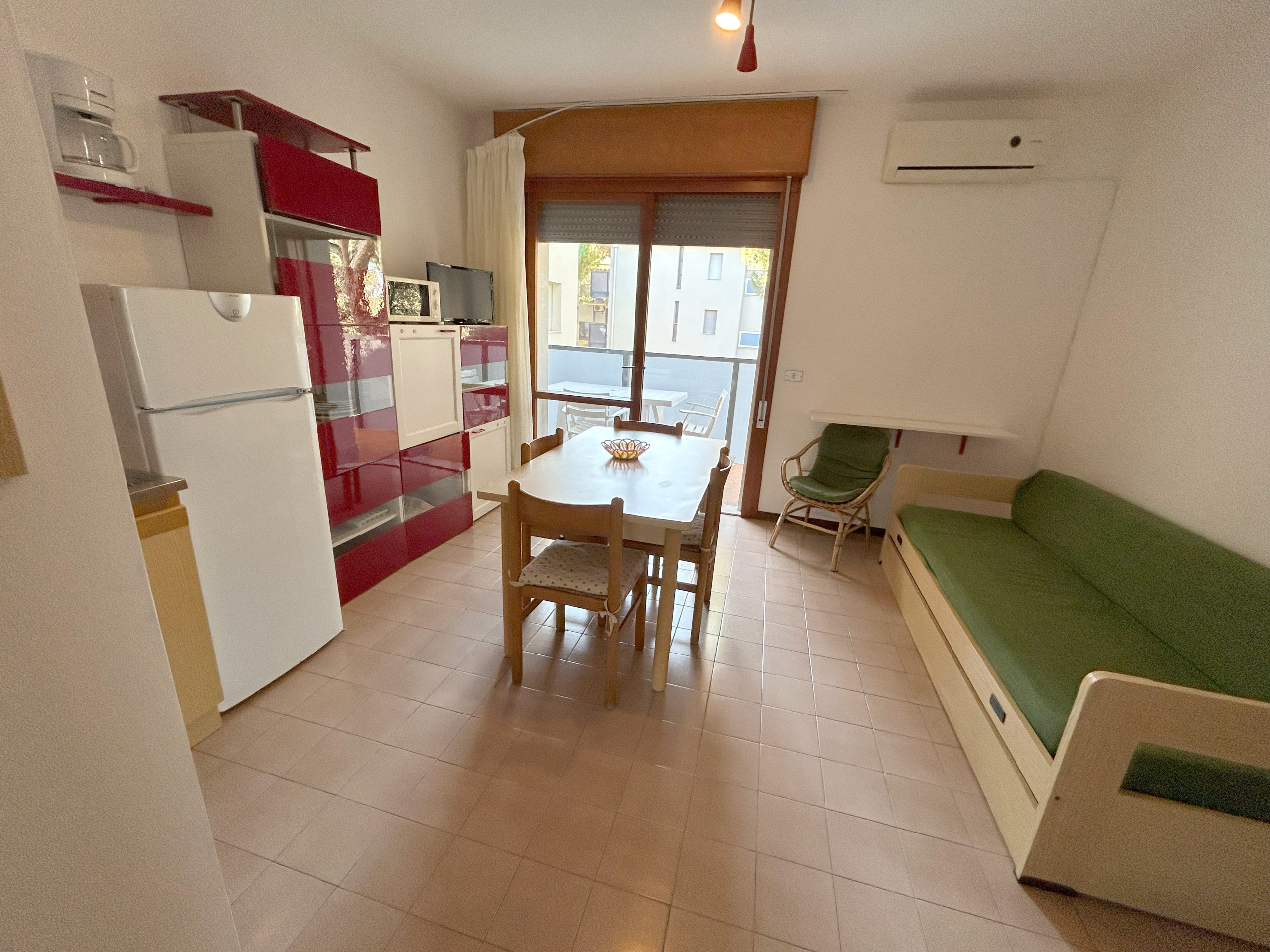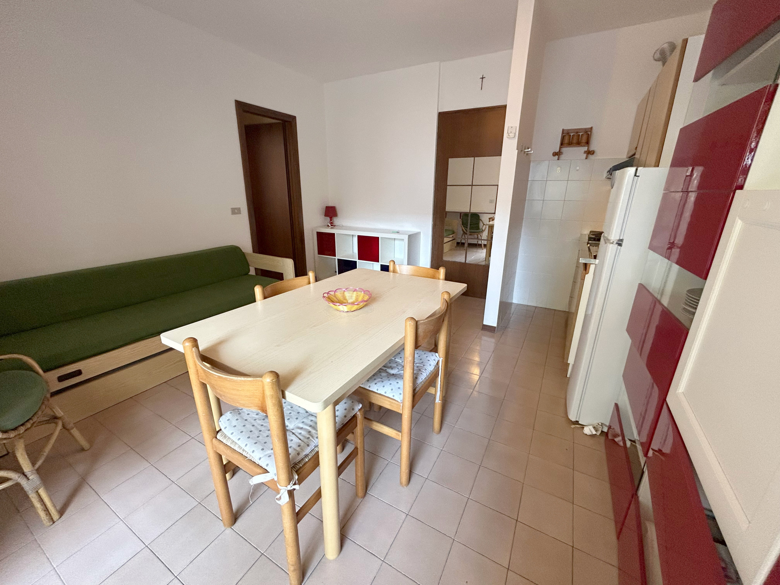 L’appartamento bilocale, situato al terzo piano ed esposto a ovest, offre un balcone soleggiato ideale per rilassarsi al tramonto o gustare un aperitivo all’aperto. All’interno si trovano un soggiorno con angolo cottura attrezzato e divano letto doppio, una camera matrimoniale e un bagno con box doccia.