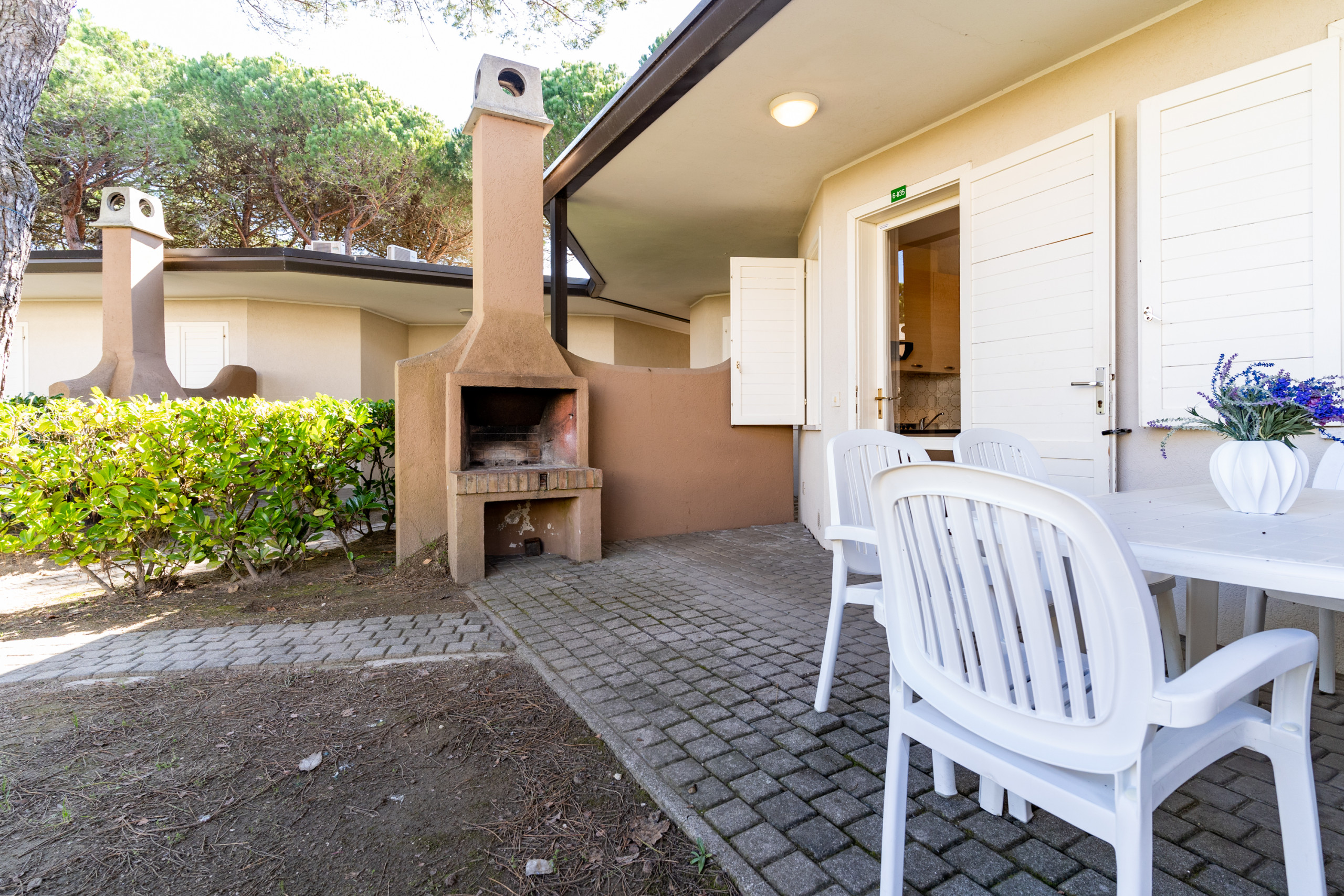 Gli appartamenti bilocali, situati al piano terra, offrono un comodo spazio esterno privato con caminetto, ideale per pranzi all’aperto o momenti di relax in famiglia.