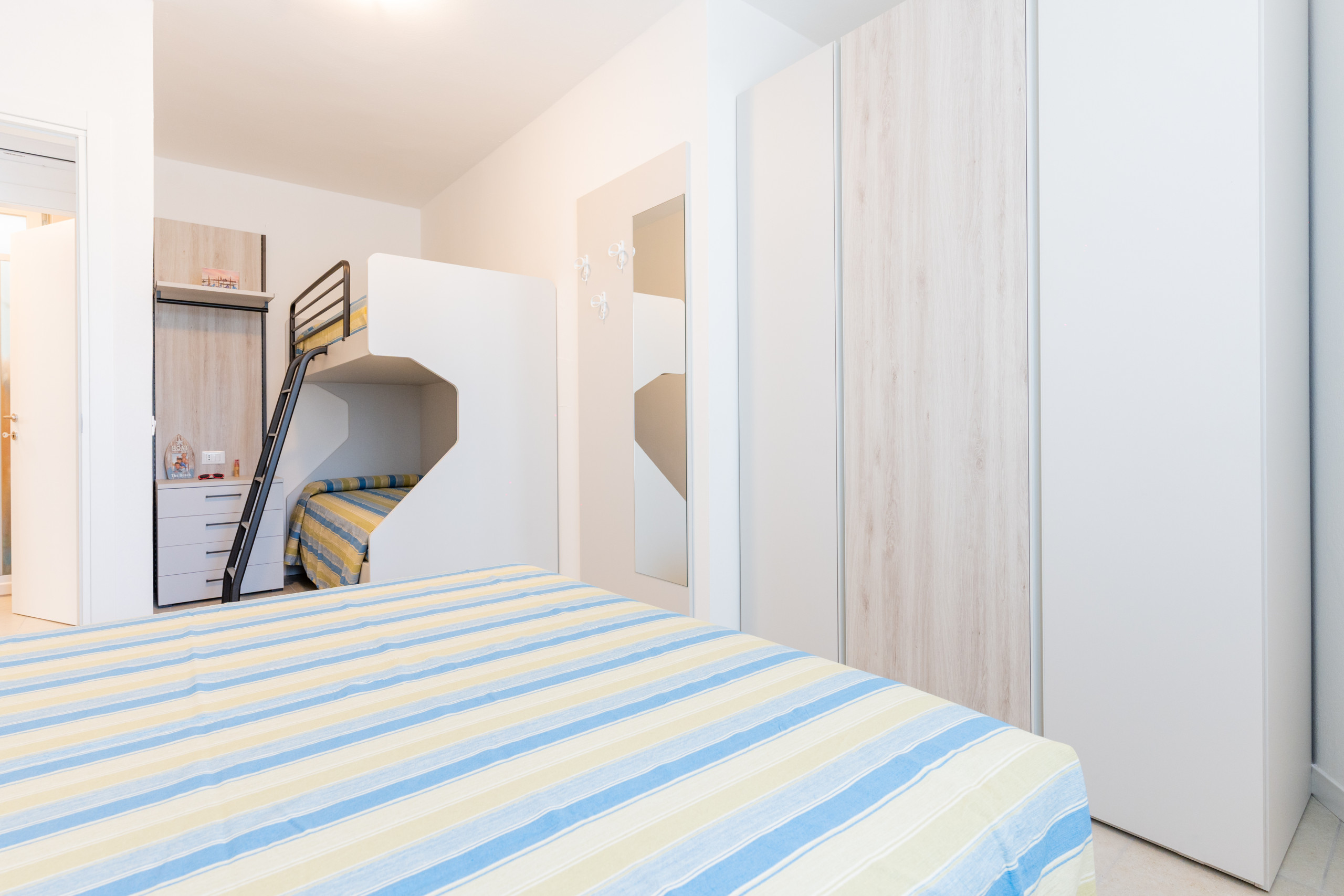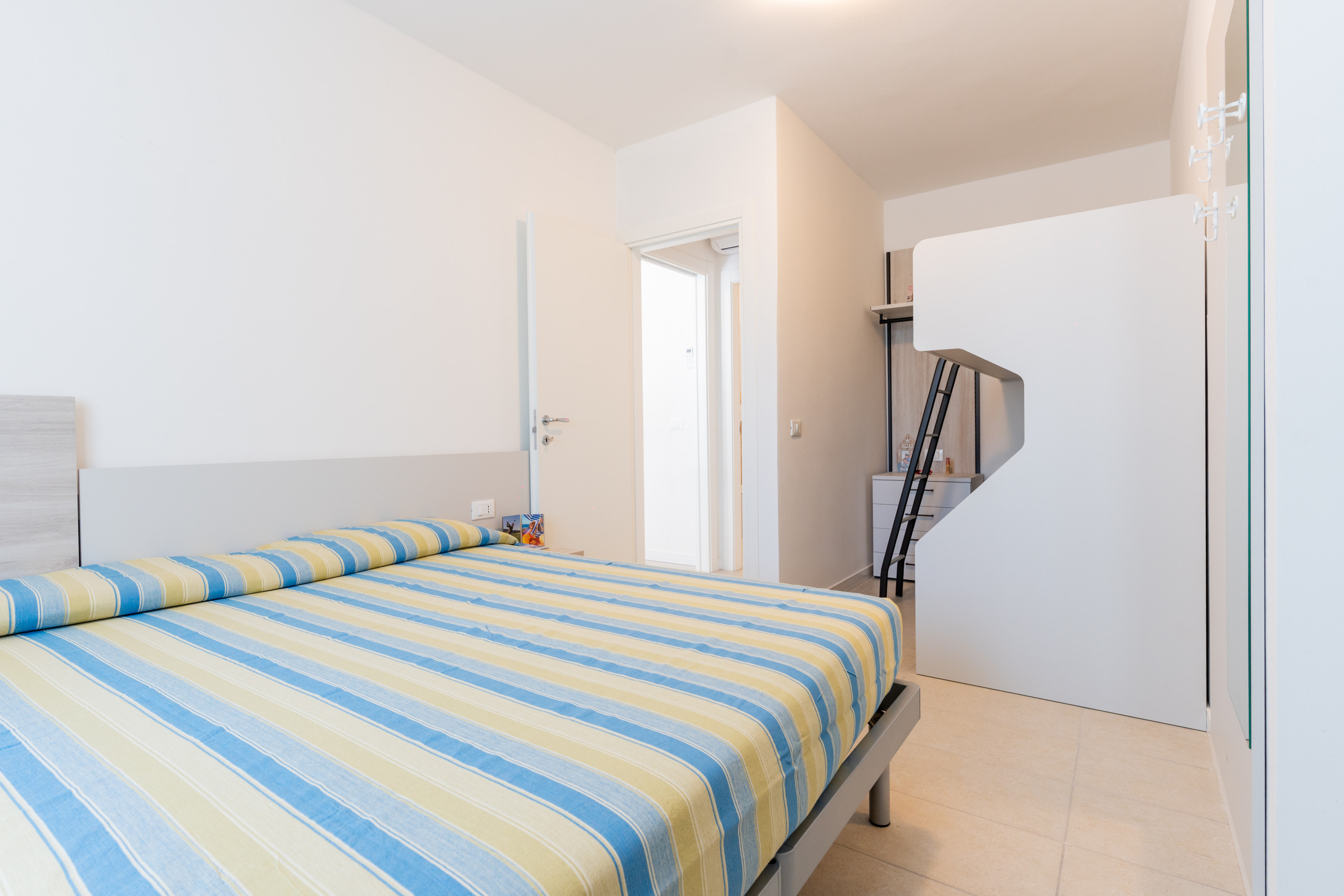 Il bilocale al quarto piano regala spazi luminosi e un ampio terrazzo esposto a nord-est, perfetto per gustare la colazione all’aperto o rilassarsi dopo una giornata di mare.