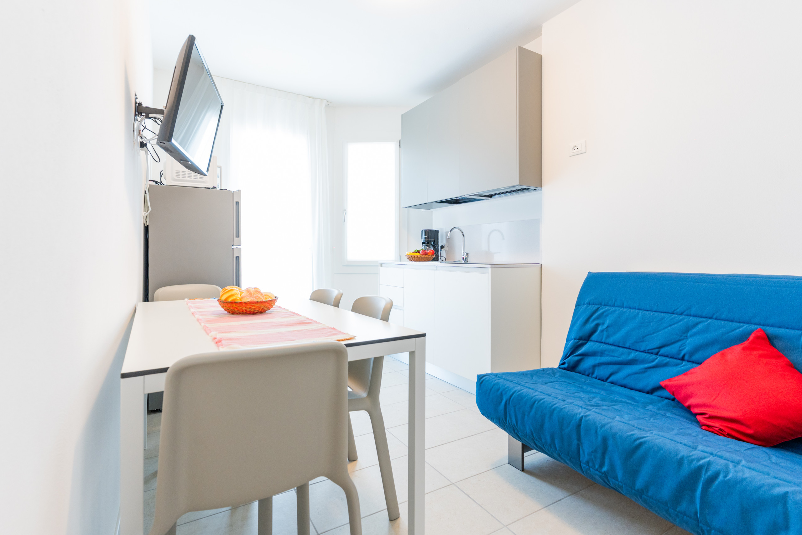 - soggiorno luminoso con angolo cottura attrezzato e divano letto singolo,