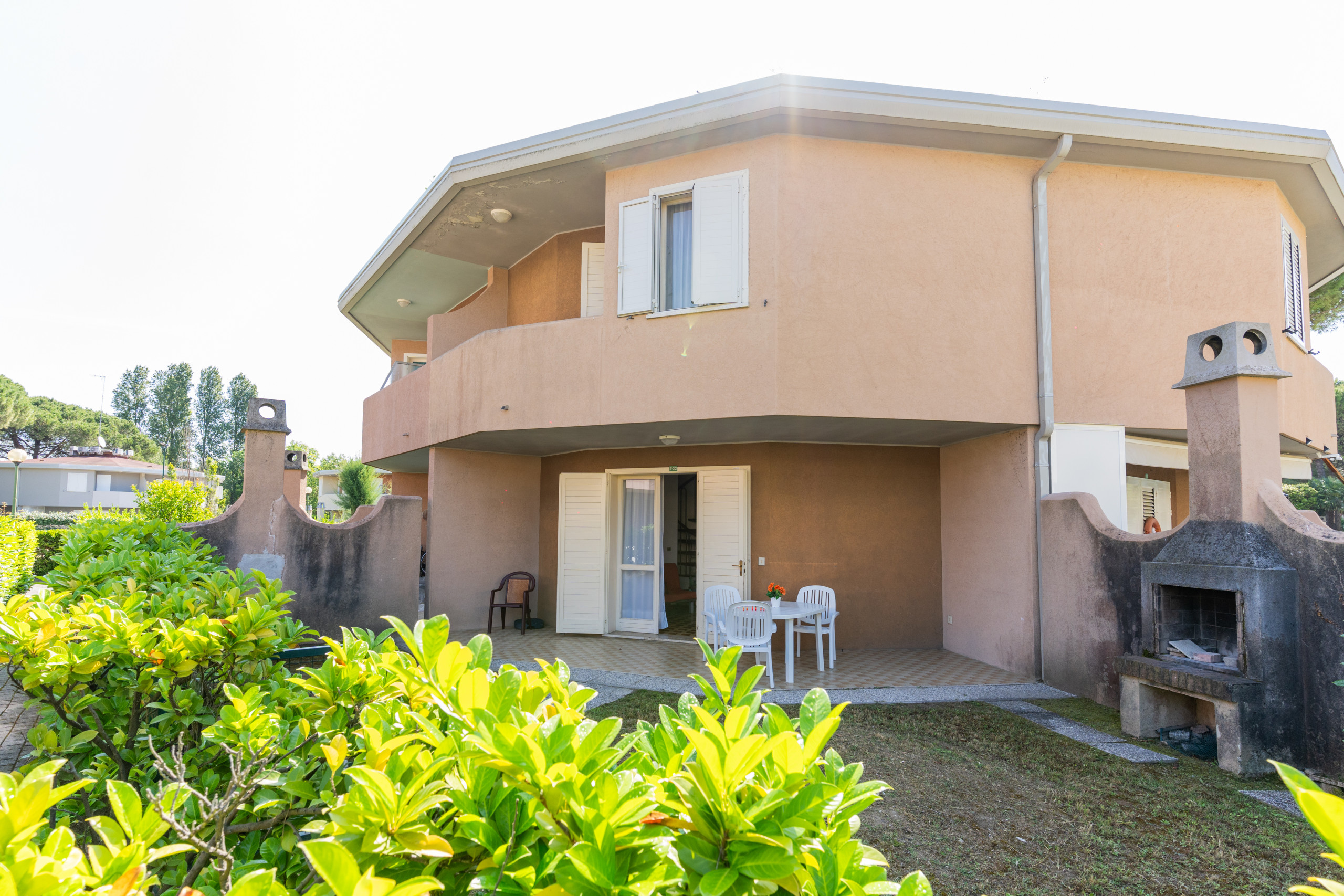 Gli appartamenti trilocali, disposti su due piani e collegati da una scala a chiocciola, offrono un’accogliente area giardino privata con caminetto, ideale per pranzi all’aperto o momenti di relax in famiglia.