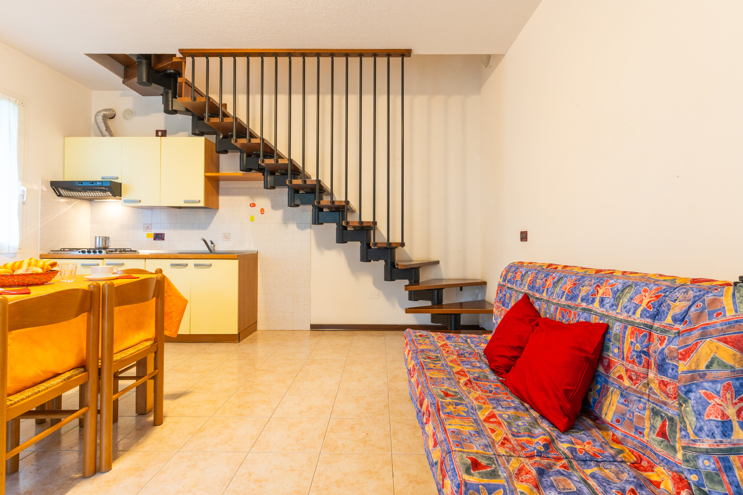 Al piano terra il soggiorno è composto da angolo cottura attrezzato, tavolo, sedie e un divano letto doppio. Al primo piano, al quale si accede tramite una scala interna, si trova una camera da letto dotata di un comodo letto matrimoniale e un letto singolo, e una seconda camera con due letti singoli. Il bagno è ampio e dotato di box doccia.