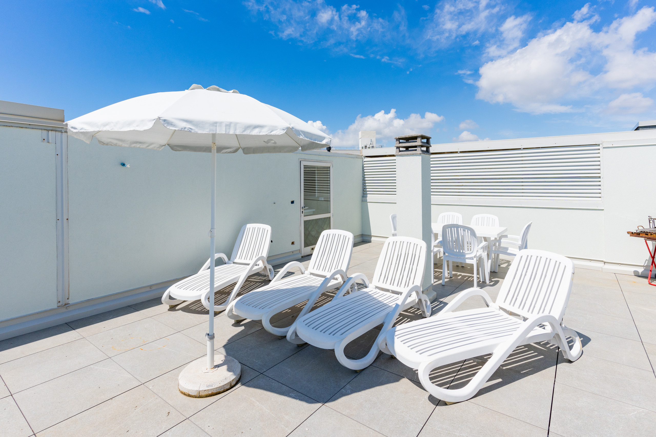 Il grande terrazzo attico, dotato di camino e secondo bagno, è il luogo ideale per cene all’aperto, momenti di relax e colazioni con vista sull’Adriatico.