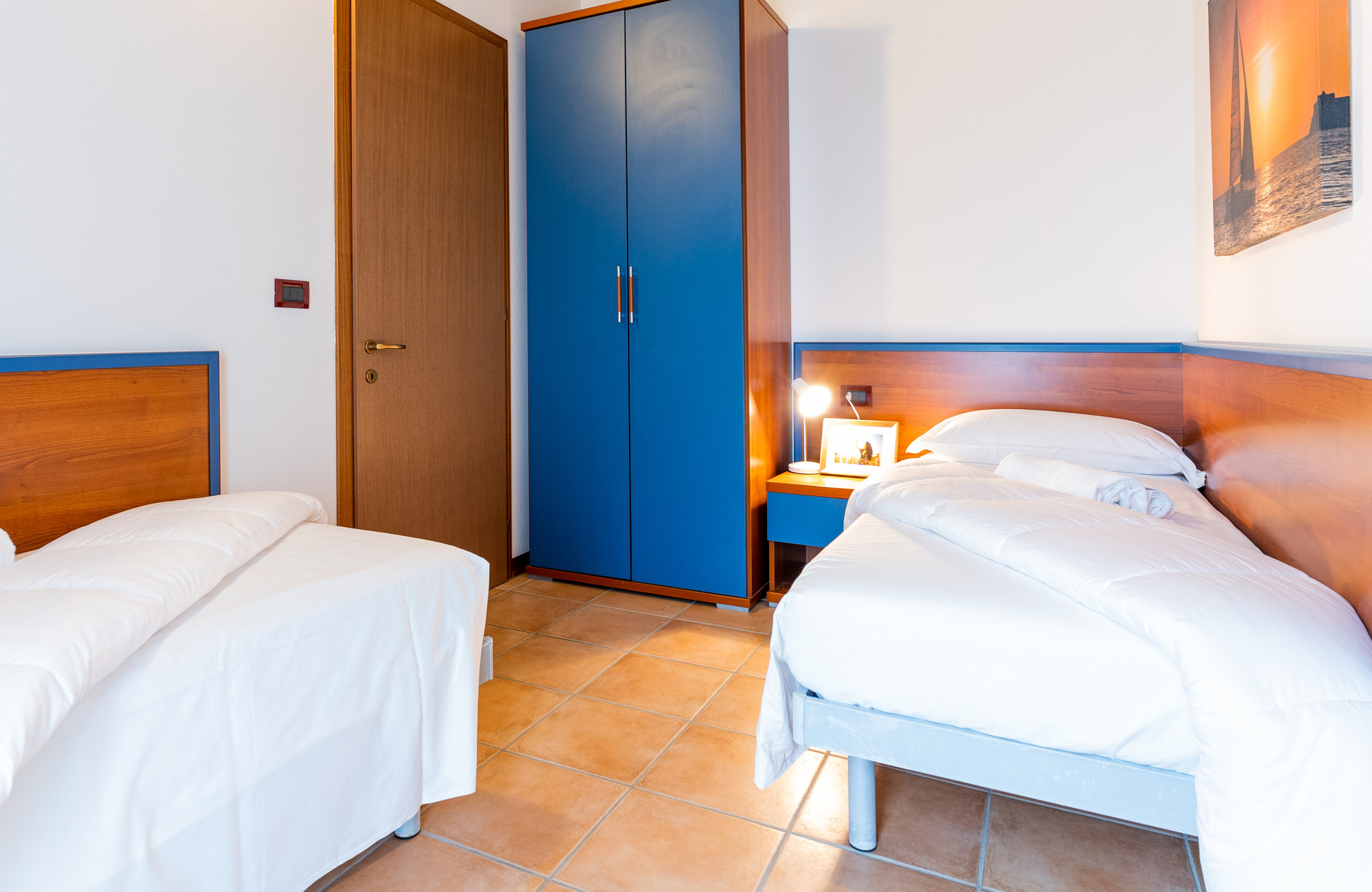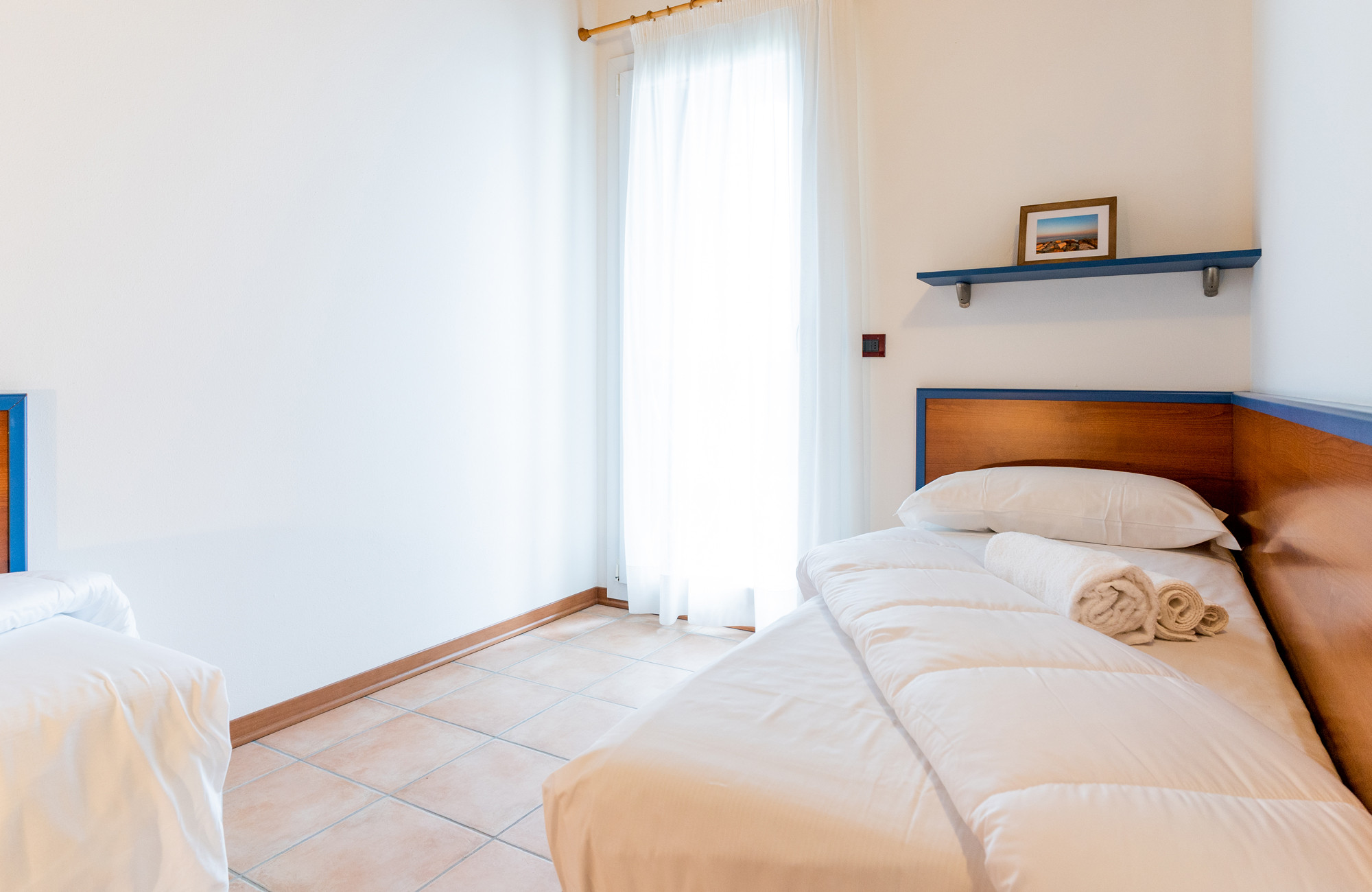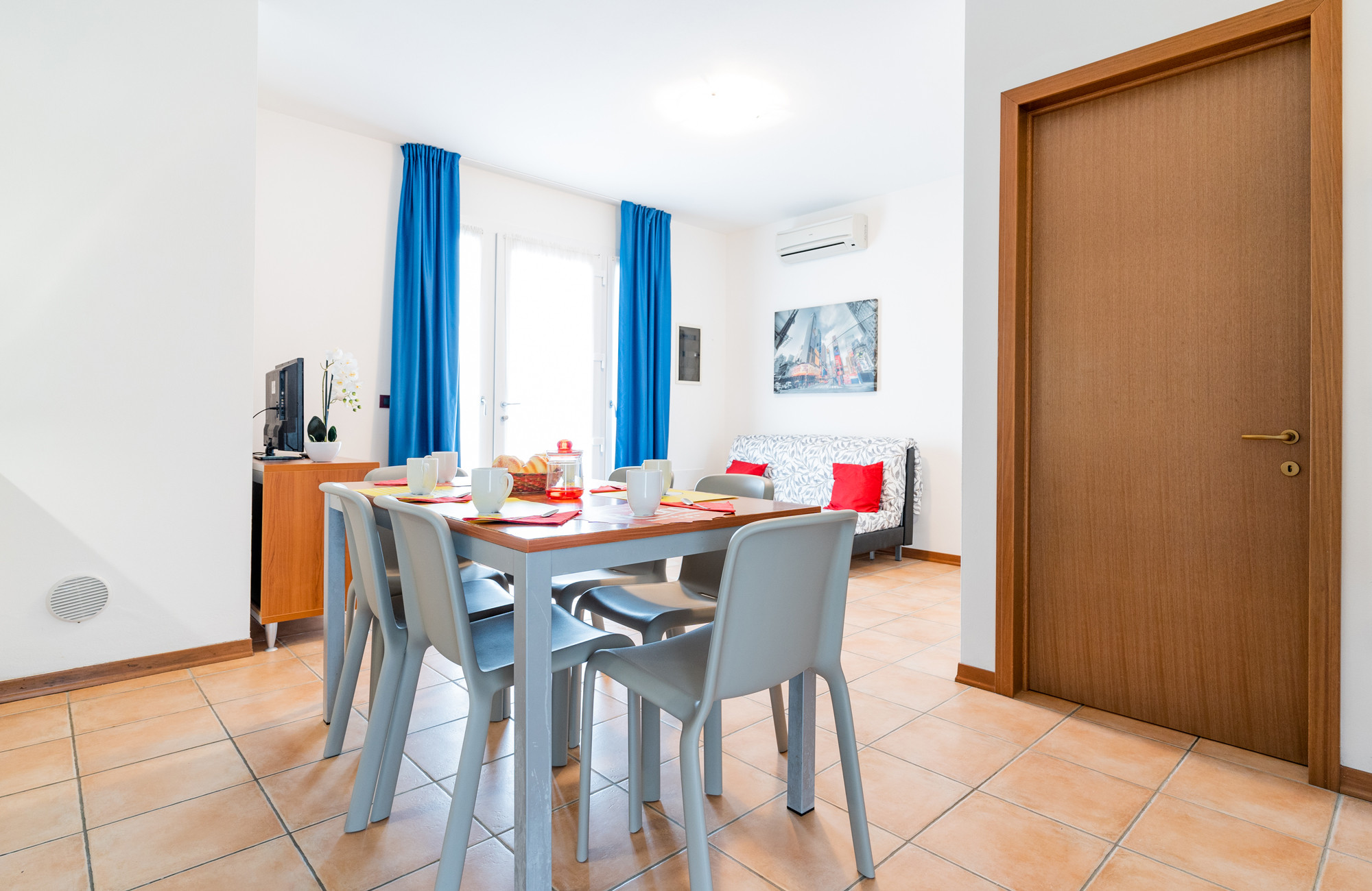 Gli appartamenti trilocali da 55 mq, situati al 1° o 2° piano, dispongono di un ampio balcone arredato con mobili da esterno, perfetto per colazioni, pranzi e cene all’aperto. Le unità sono servite da ascensore, per un accesso ancora più comodo.