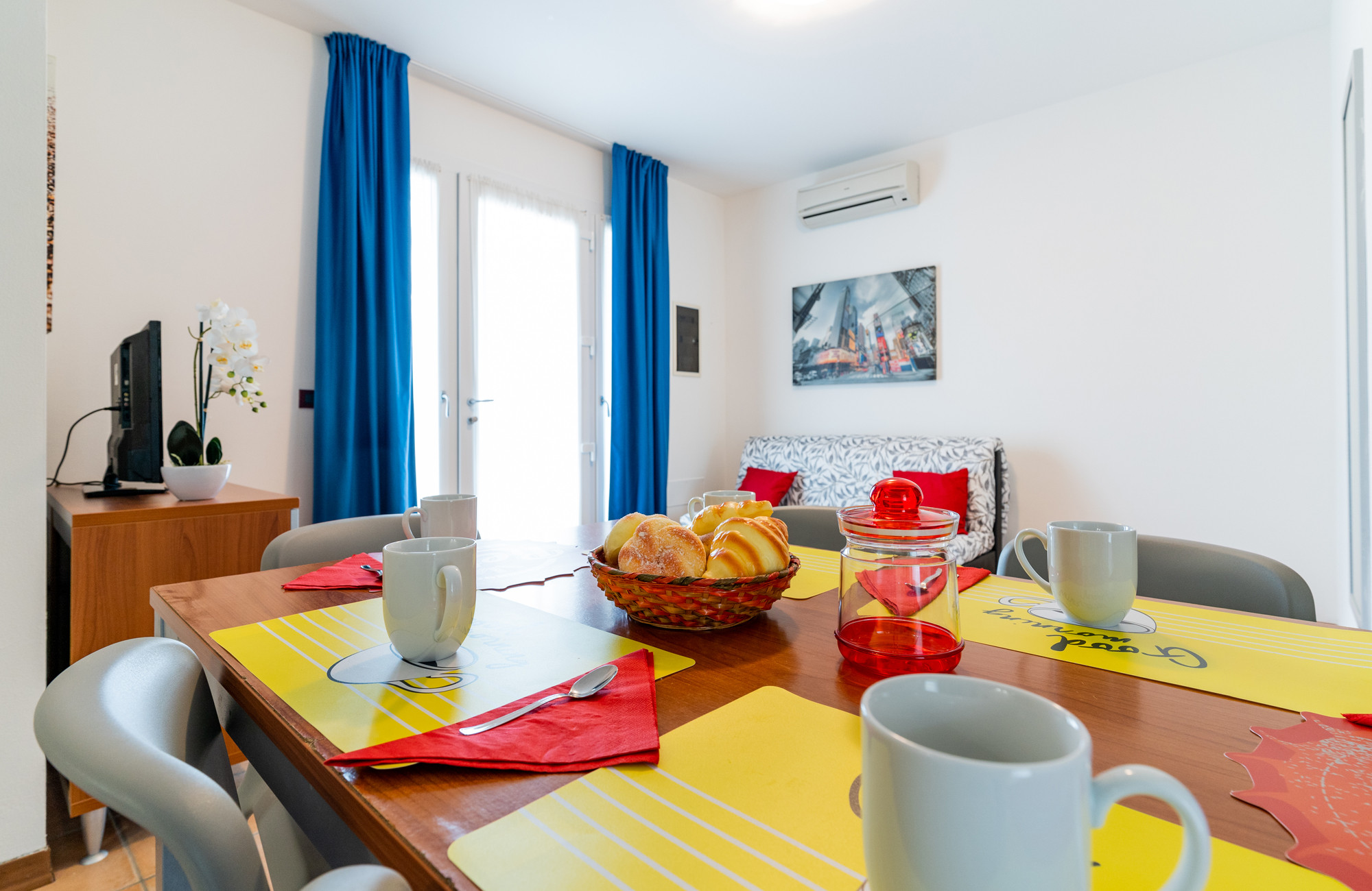 - soggiorno accogliente con angolo cottura attrezzato, tavolo con sedie, divano letto matrimoniale alla francese e accesso diretto al balcone arredato;