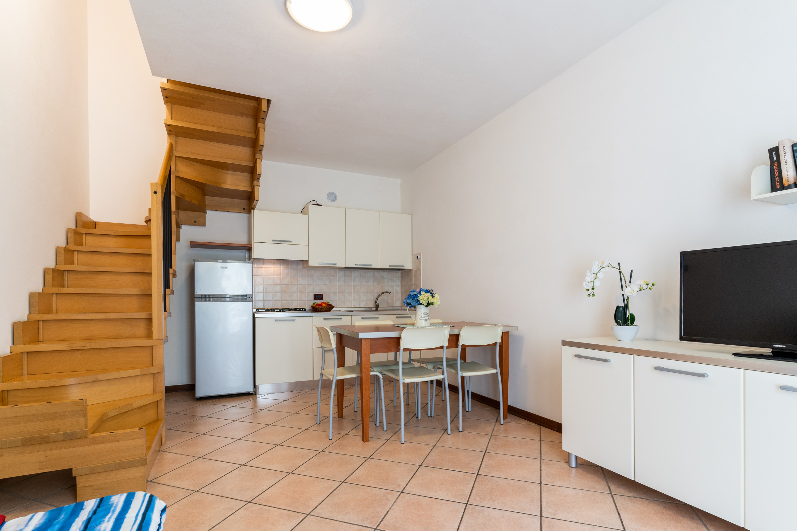 Al piano terra, si trova un soggiorno con angolo cottura e un confortevole divano letto matrimoniale alla francese, creando un ambiente accogliente. Salendo tramite scala interna, si raggiunge una camera da letto con balcone, dotata di letto matrimoniale e letto singolo, oltre a un ampio bagno con box doccia.