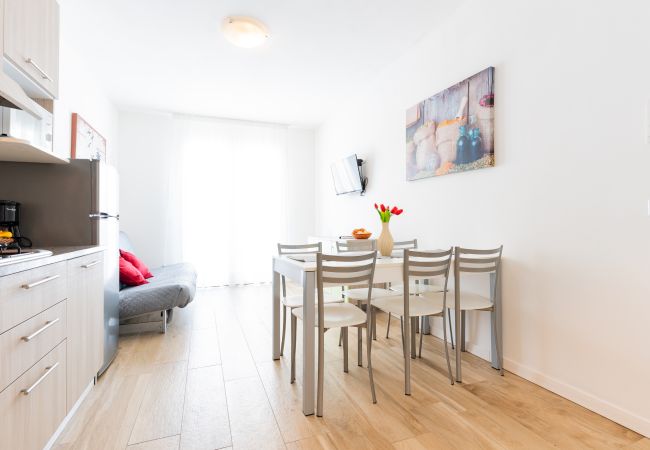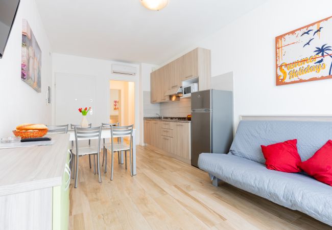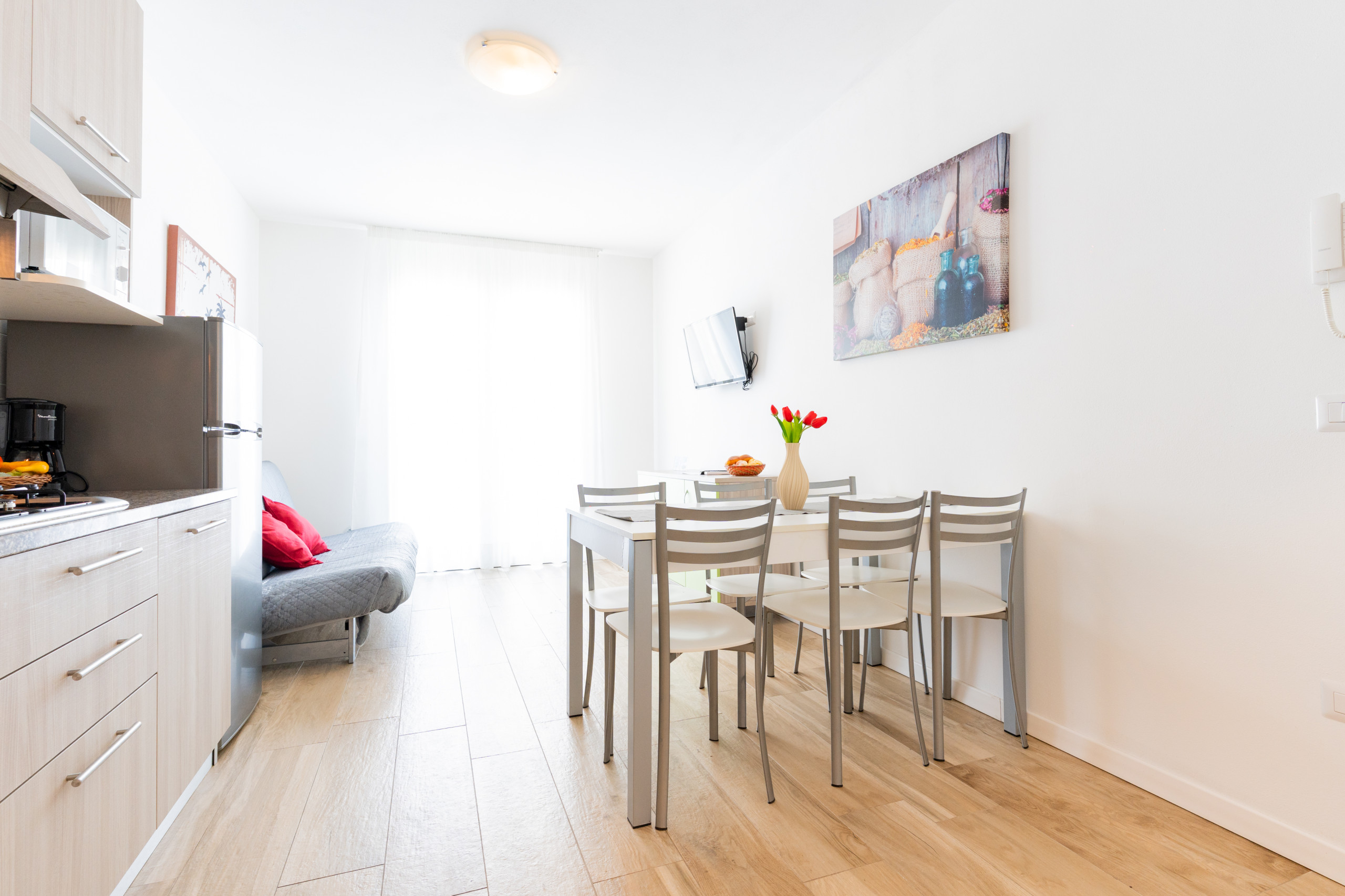 • soggiorno luminoso con angolo cottura attrezzato, tavolo da pranzo, divano letto matrimoniale alla francese e accesso a terrazzo o balcone;