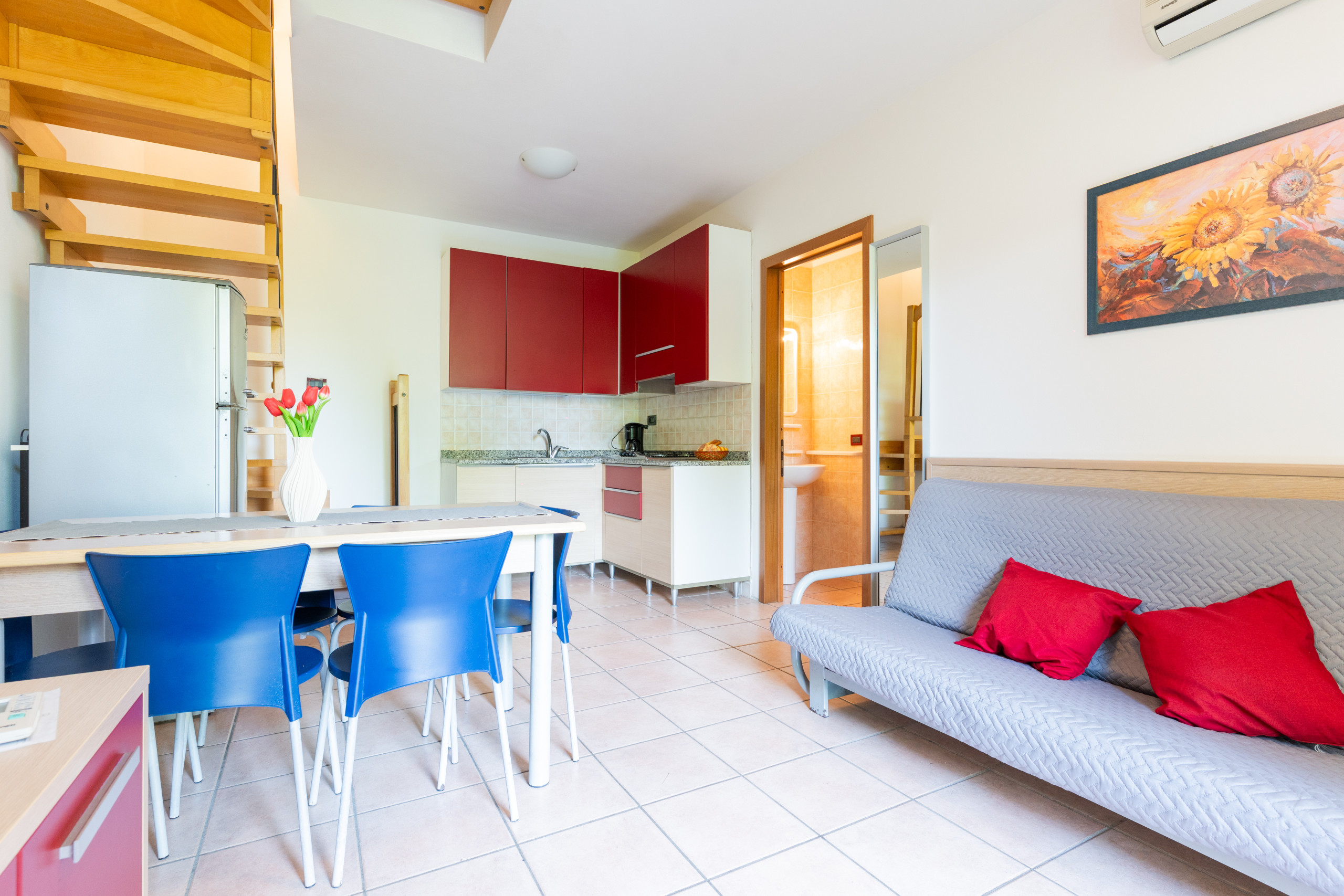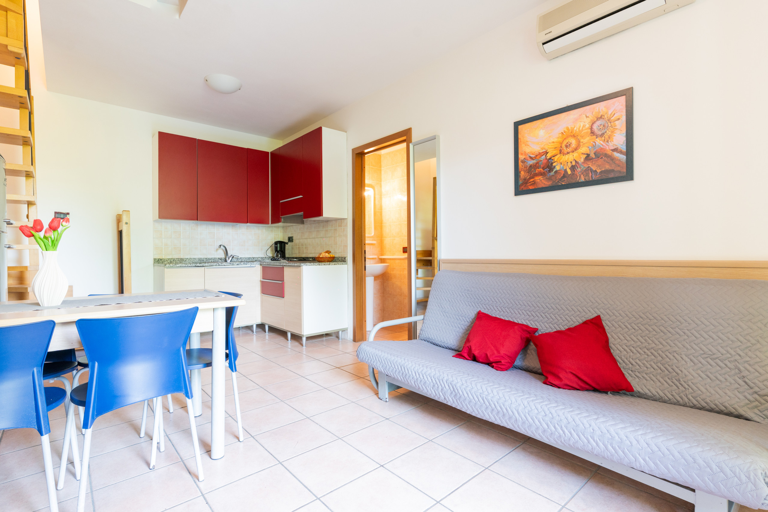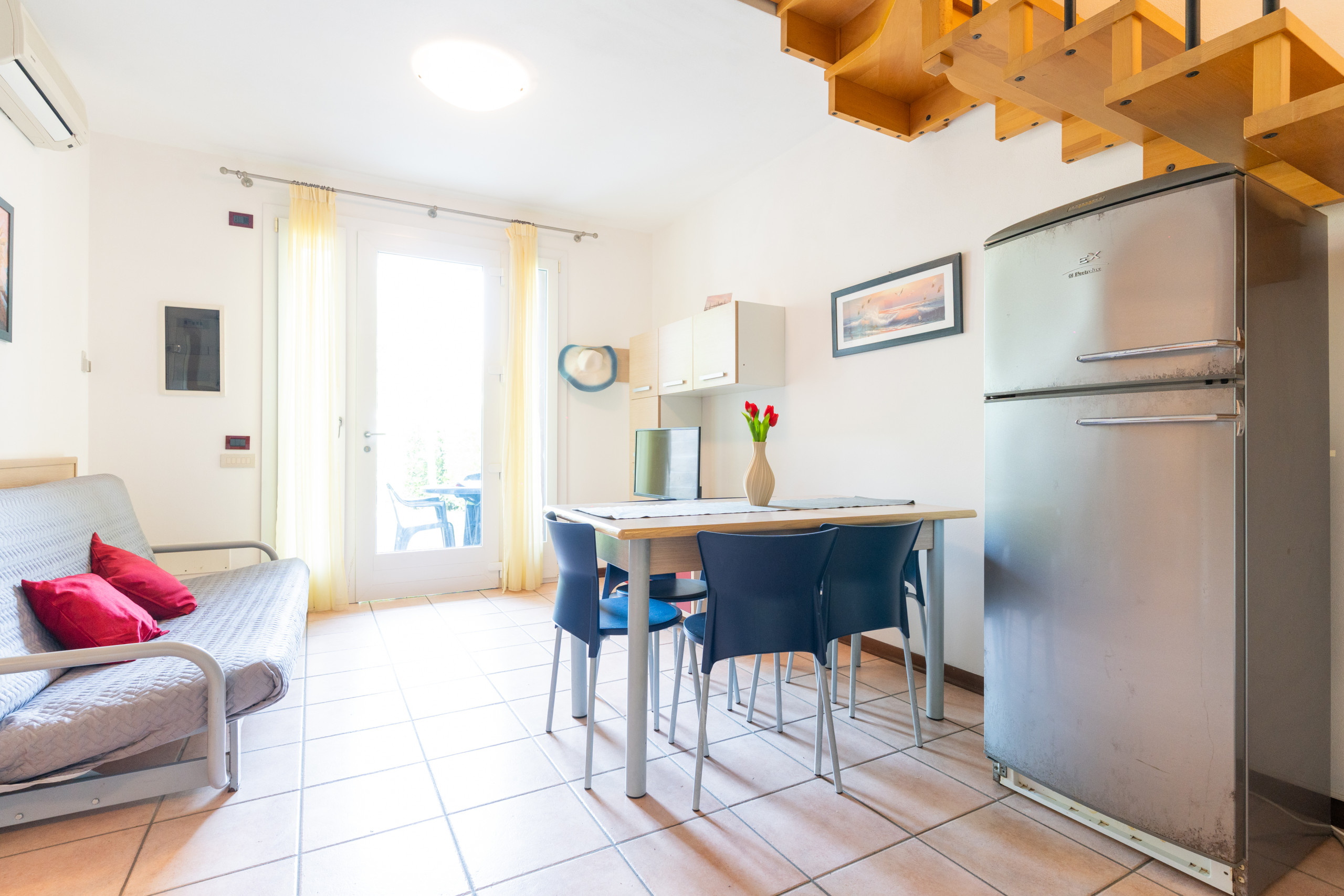 Al piano terra si trova il soggiorno con angolo cottura e un comodo divano letto matrimoniale alla francese, insieme a un bagno dotato di box doccia. Salendo al primo piano tramite la scala interna, si trova la camera principale con balcone, arredata con letto matrimoniale e letto singolo aggiunto, una seconda camera con due letti singoli e un ampio bagno con box doccia.