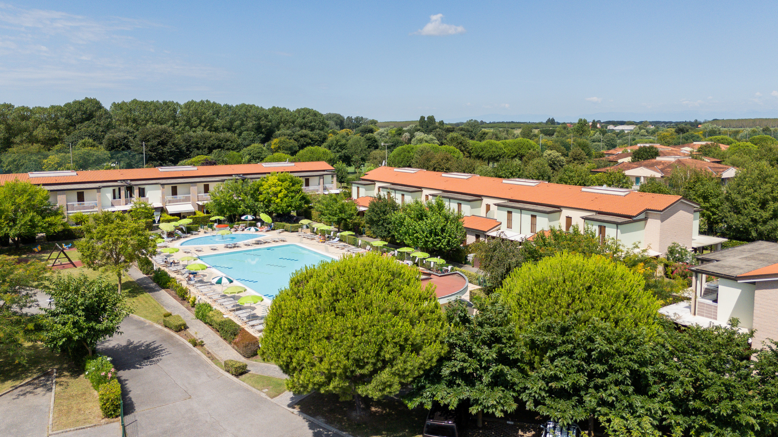 Il villaggio offre ampi giardini comuni con vialetti pedonali, piscina per adulti e piscina dedicata ai bambini, area giochi e zona barbecue. Sono presenti parcheggi scoperti e autorimessa, mentre il Wi-Fi è disponibile gratuitamente nelle aree comuni.
