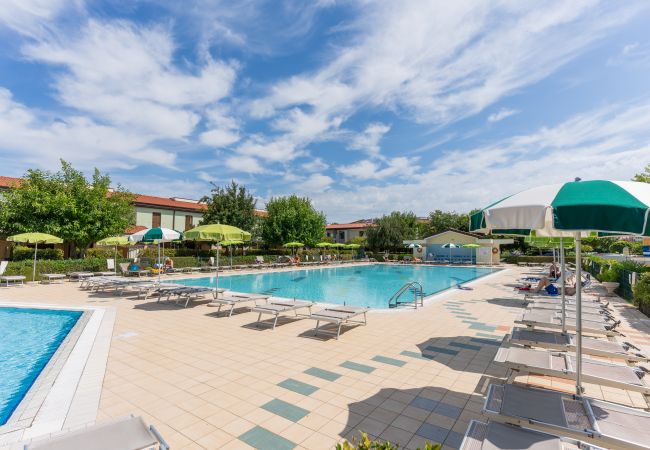 Tutti gli appartamenti si sviluppano su un unico livello e alcuni offrono la vista sulla piscina e altri con vista lateralmente. Il soggiorno dispone di angolo cottura attrezzato, tavolo, sedie e divano letto matrimoniale alla francese, con accesso al balcone o al giardino, ideale per pranzi e cene all’aperto. La camera principale è arredata con letto matrimoniale e letto singolo, mentre la seconda camera offre due letti singoli. Il bagno è spazioso e dotato di box doccia.