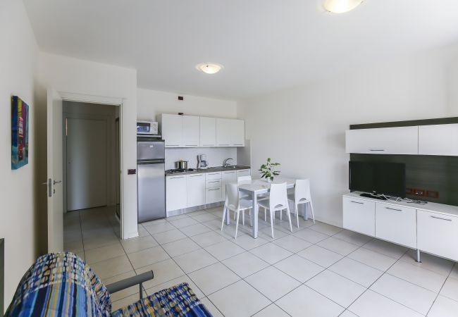 Tutti gli appartamenti si sviluppano su un unico livello e alcuni offrono la vista sulla piscina e altri con vista lateralmente. Il soggiorno dispone di angolo cottura attrezzato, tavolo, sedie e divano letto matrimoniale alla francese, con accesso al balcone o al giardino, ideale per pranzi e cene all’aperto. La camera principale è arredata con letto matrimoniale e letto singolo, mentre la seconda camera offre due letti singoli. Il bagno è spazioso e dotato di box doccia.