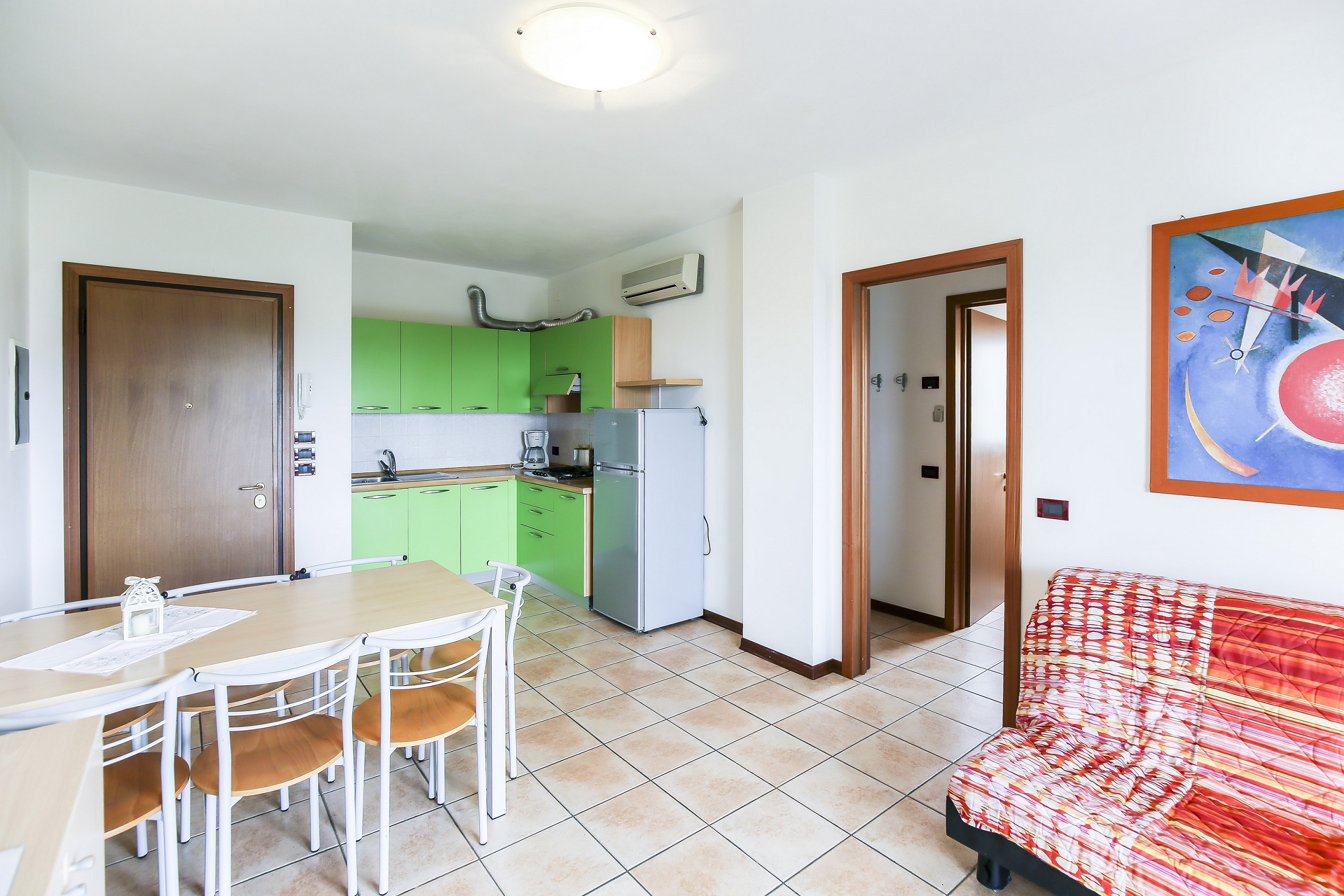 • soggiorno luminoso con angolo cottura attrezzato, tavolo da pranzo, divano letto matrimoniale alla francese e accesso a terrazzo o balcone;