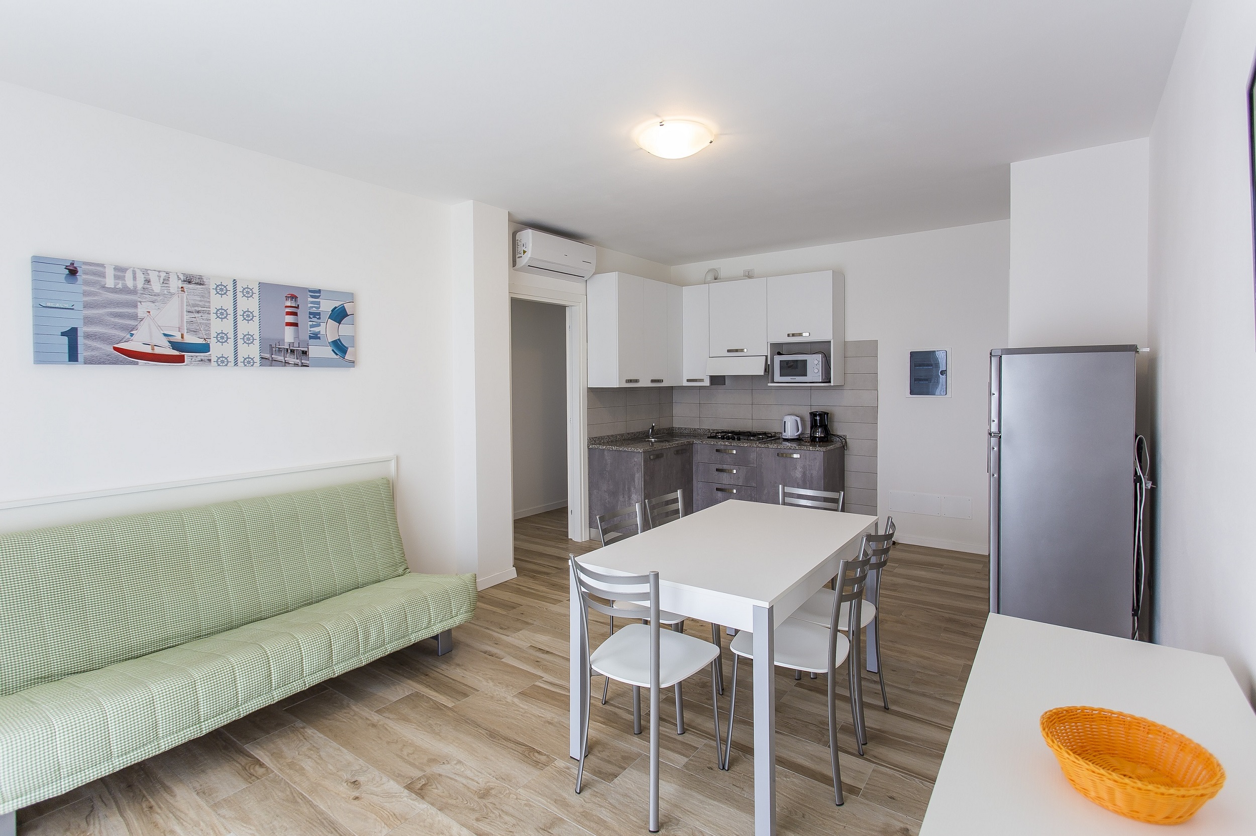 Appartamento bilocale per 5 persone, soggiorno con divano letto matrimoniale e angolo cottura, balcone, bagno, camera matrimoniale con terzo letto, arredamento nuovo, cassaforte, microonde.Il Residence "Mimose" sorge a soli 400 m dal mare, vicino al centro commerciale "La Quercia", composto da appartamenti bivani e trivani. Piscina per adulti e bambini e plateatico con lettini prendisole e ombrelloni. Posto auto in autorimessa o scoperto. Piscina da META' MAGGIO