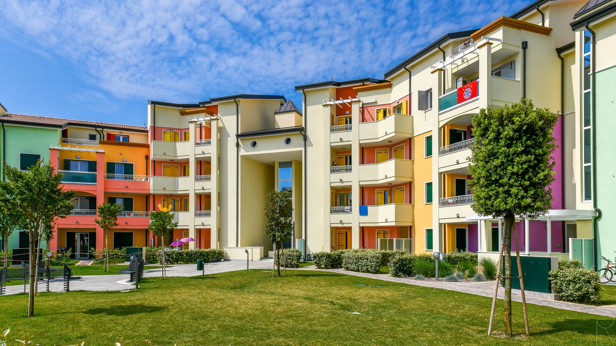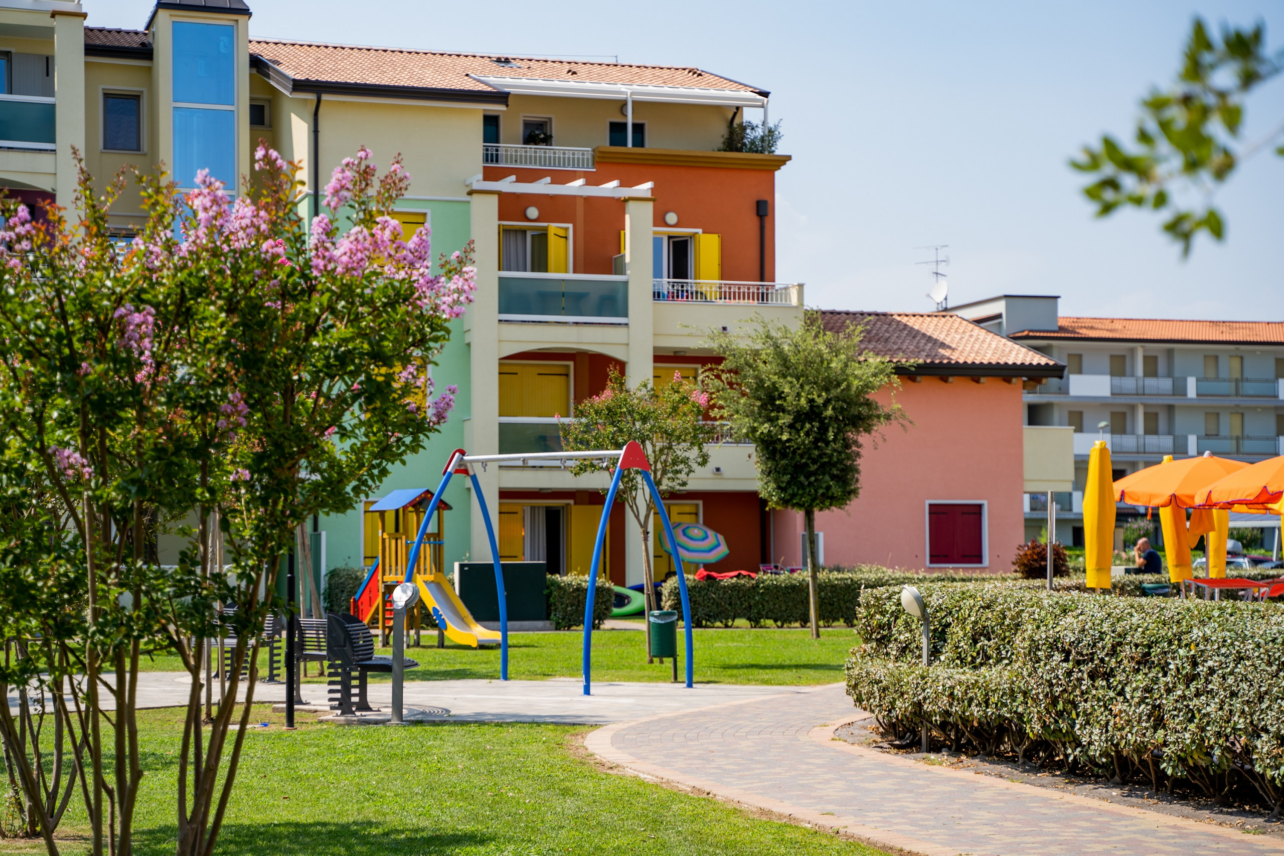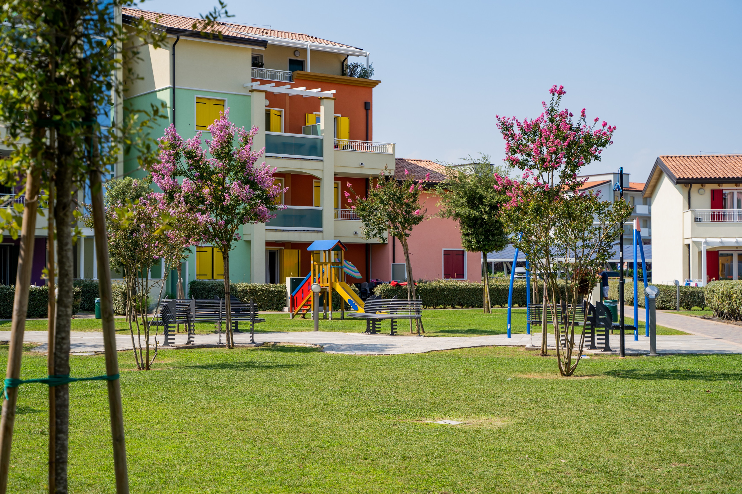 Le villette godono di esposizioni diverse: verso la piscina oppure verso il vialetto interno. Alcune unità dispongono di giardino e portico arredato, altre di solo portico, sempre attrezzato con tavolo e sedie esterne, ideale per pranzi e cene all’aperto.