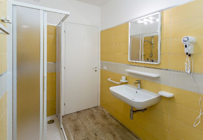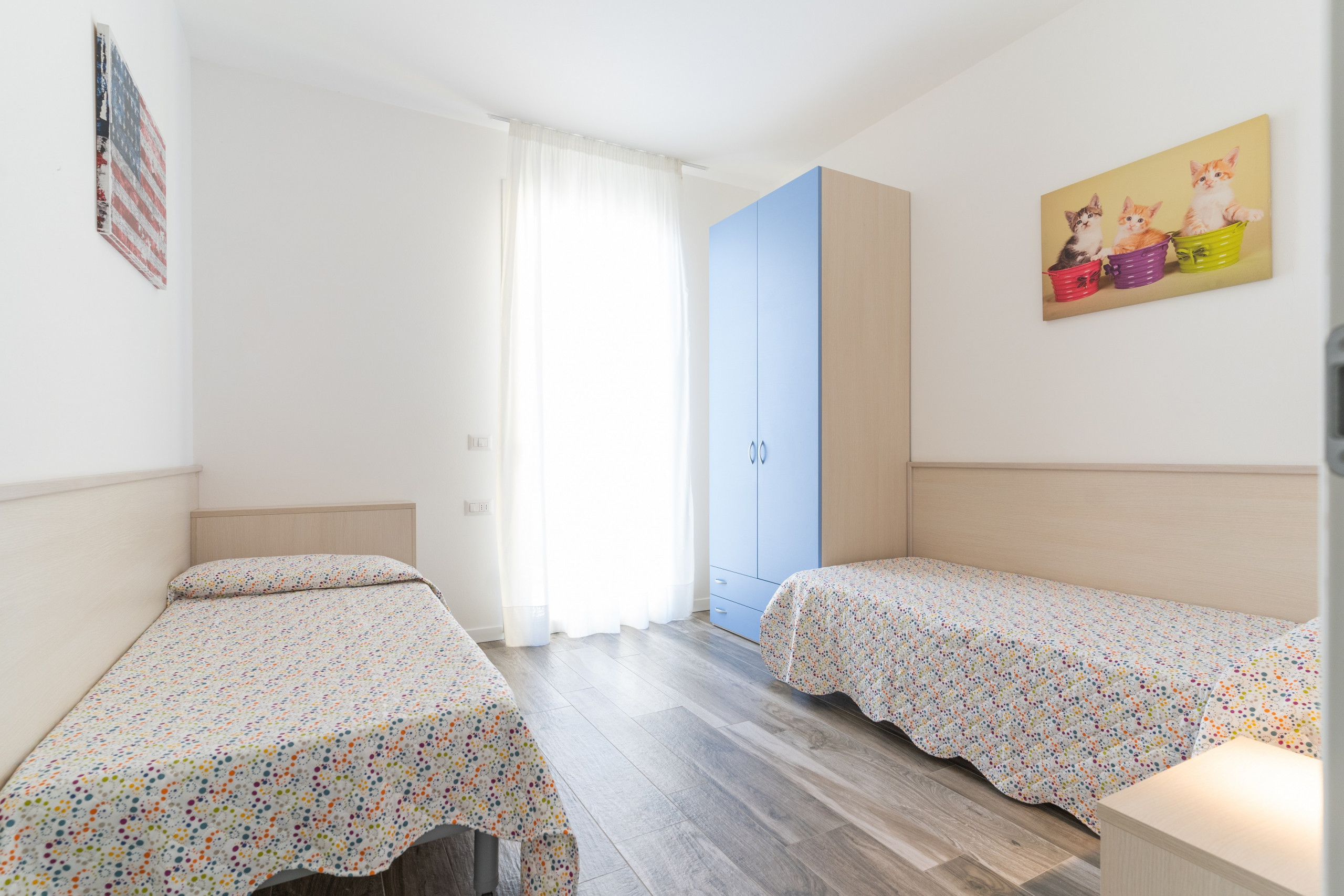 Tutti gli appartamenti si sviluppano su un unico livello e alcuni offrono la vista sulla piscina e altri con vista lateralmente. Il soggiorno dispone di angolo cottura attrezzato, tavolo, sedie e divano letto matrimoniale alla francese, con accesso al balcone o al giardino, ideale per pranzi e cene all’aperto. La camera principale è arredata con letto matrimoniale e letto singolo, mentre la seconda camera offre due letti singoli. Il bagno è spazioso e dotato di box doccia.