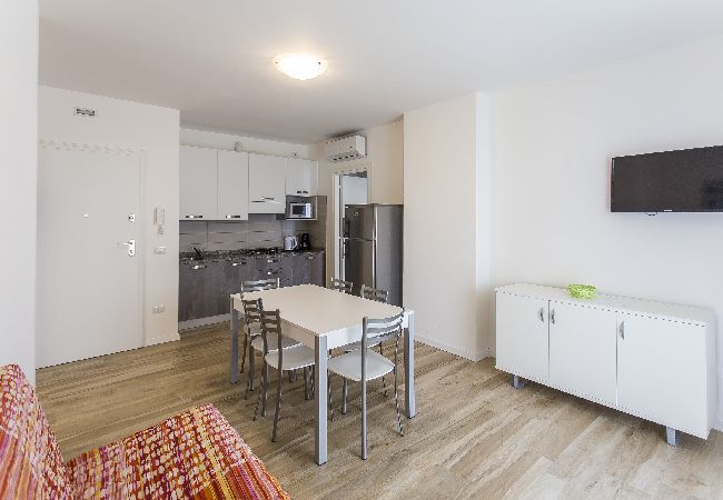 Appartamento trilocale per 7 persone, soggiorno con divano letto matrimoniale e angolo cottura, balcone, 1 bagno, camera matrimoniale con terzo letto, camera con 2 letti, arredamento nuovo, cassaforte, microonde.Il Residence "Mimose" sorge a soli 400 m dal mare, vicino al centro commerciale "La Quercia", composto da appartamenti bivani e trivani. Piscina per adulti e bambini e plateatico con lettini prendisole e ombrelloni. Posto auto in autorimessa o scoperto. Piscina da META' MAGGIO