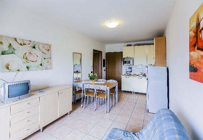 Tutti gli appartamenti si sviluppano su un unico livello e alcuni offrono la vista sulla piscina e altri con vista lateralmente. Il soggiorno dispone di angolo cottura attrezzato, tavolo, sedie e divano letto matrimoniale alla francese, con accesso al balcone o al giardino, ideale per pranzi e cene all’aperto. La camera principale è arredata con letto matrimoniale e letto singolo, mentre la seconda camera offre due letti singoli. Il bagno è spazioso e dotato di box doccia.