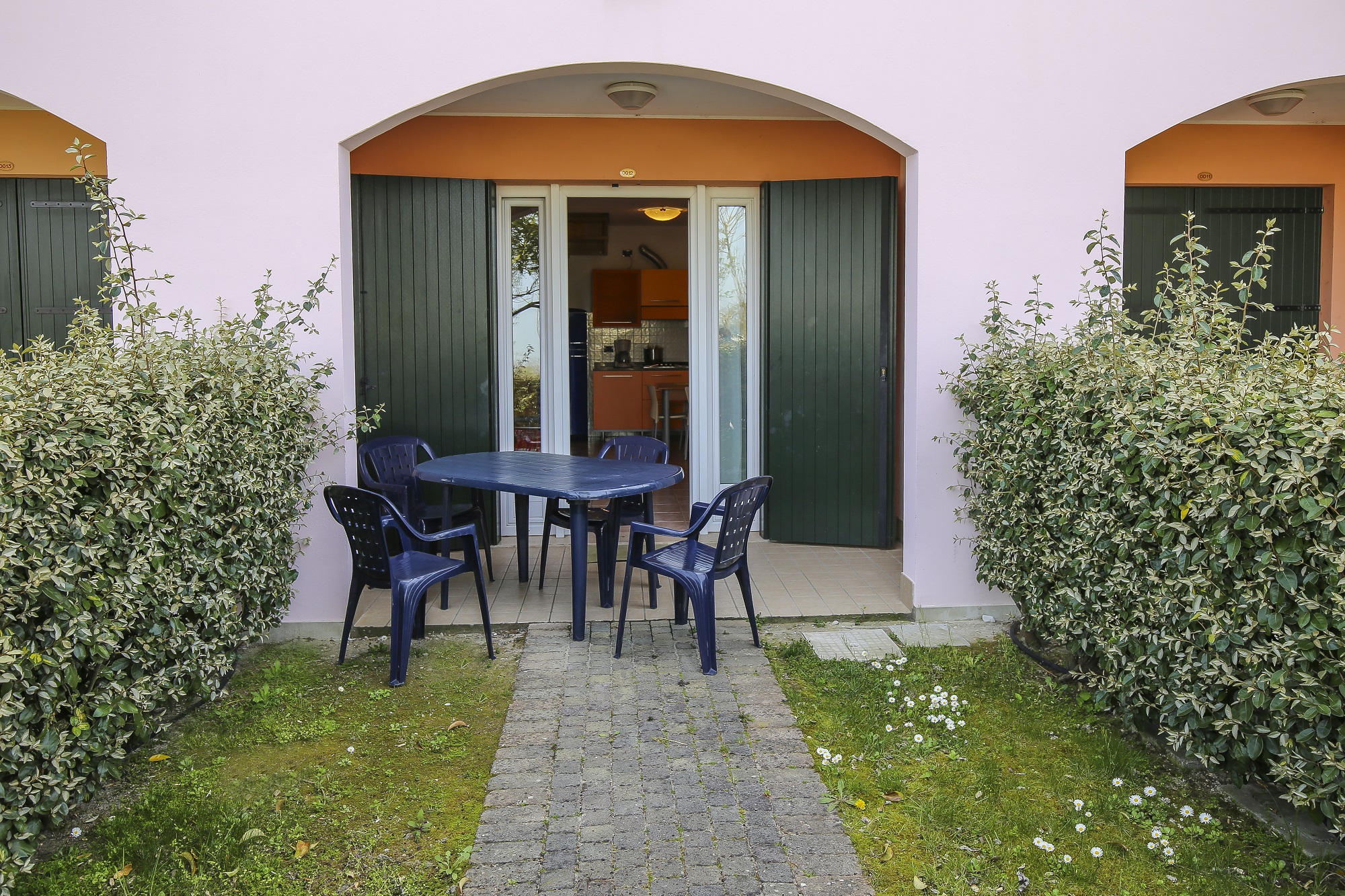 Le villette godono di esposizioni diverse: verso la piscina oppure verso il vialetto interno. Alcune unità dispongono di giardino e portico arredato, altre di solo portico, sempre attrezzato con tavolo e sedie esterne, ideale per pranzi e cene all’aperto.
