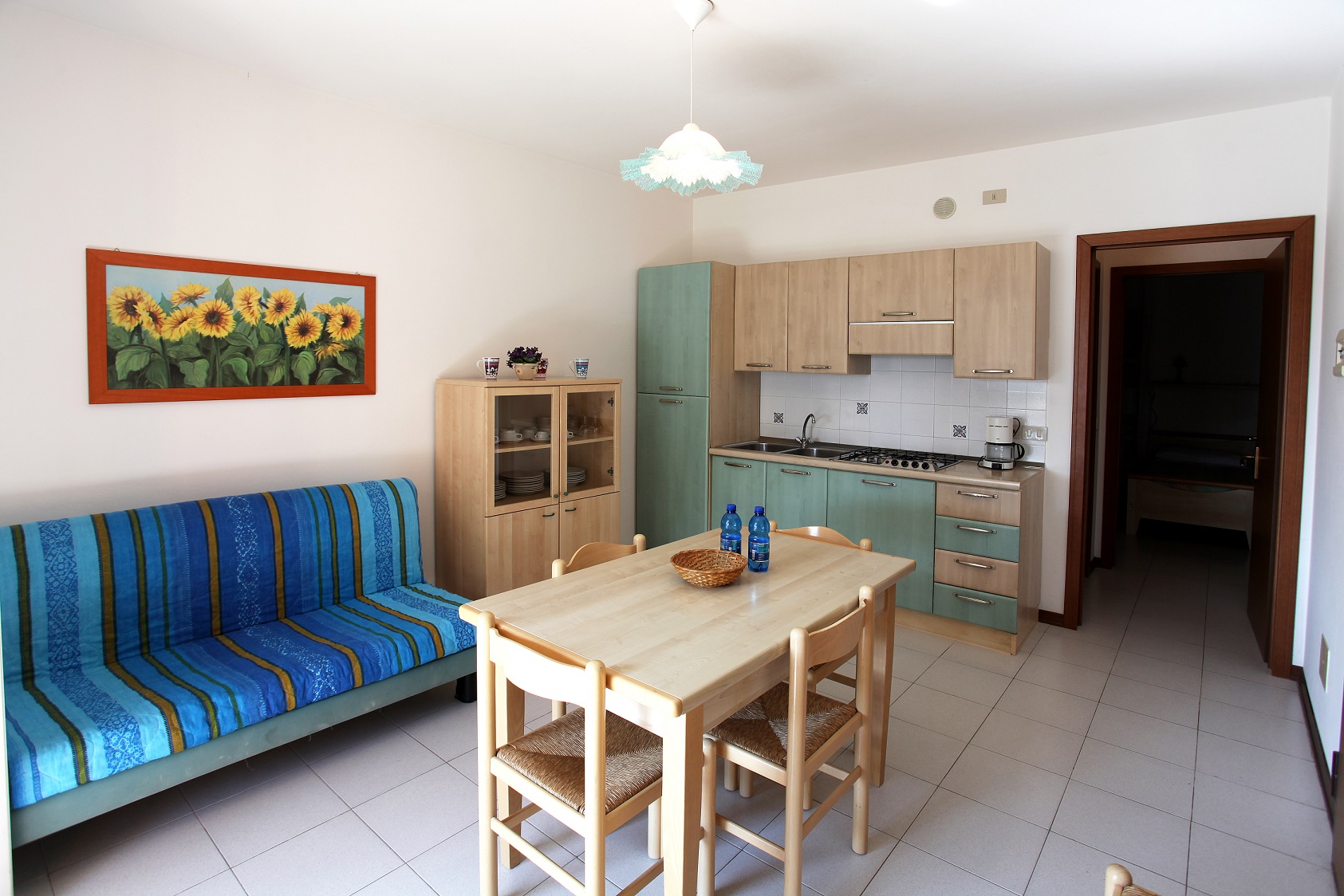 Ogni villetta (45 mq) è disposta su due piani: al piano terra troviamo un soggiorno con angolo cottura e un comodo divano letto matrimoniale alla francese;