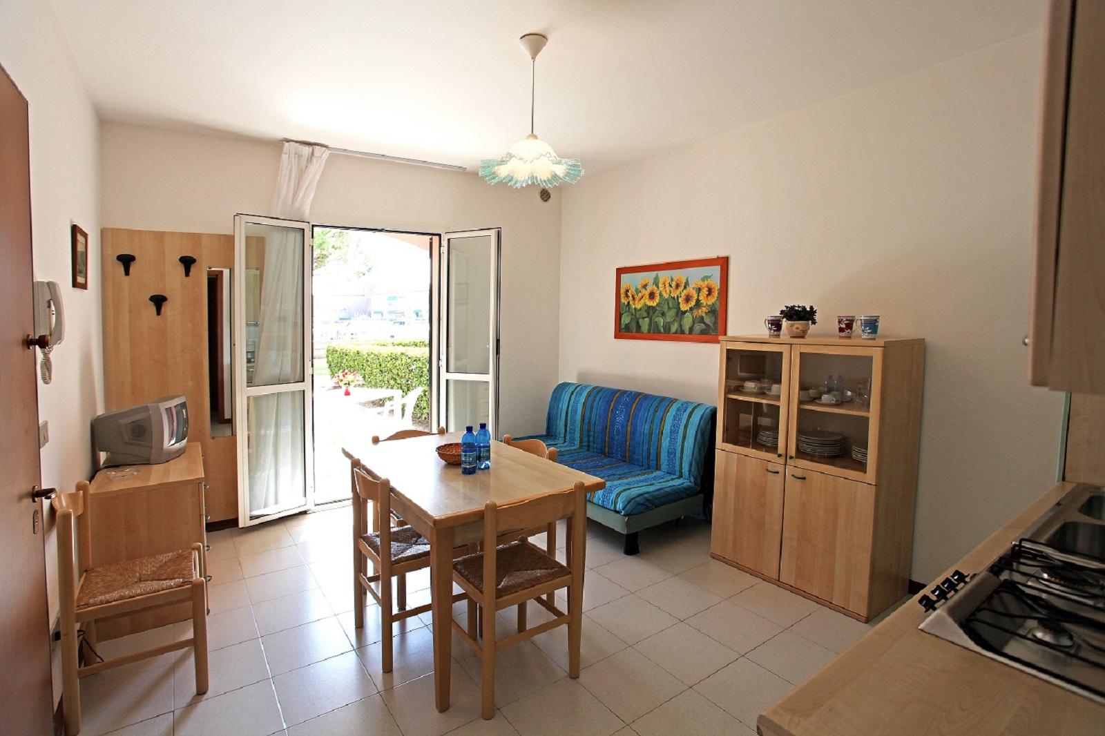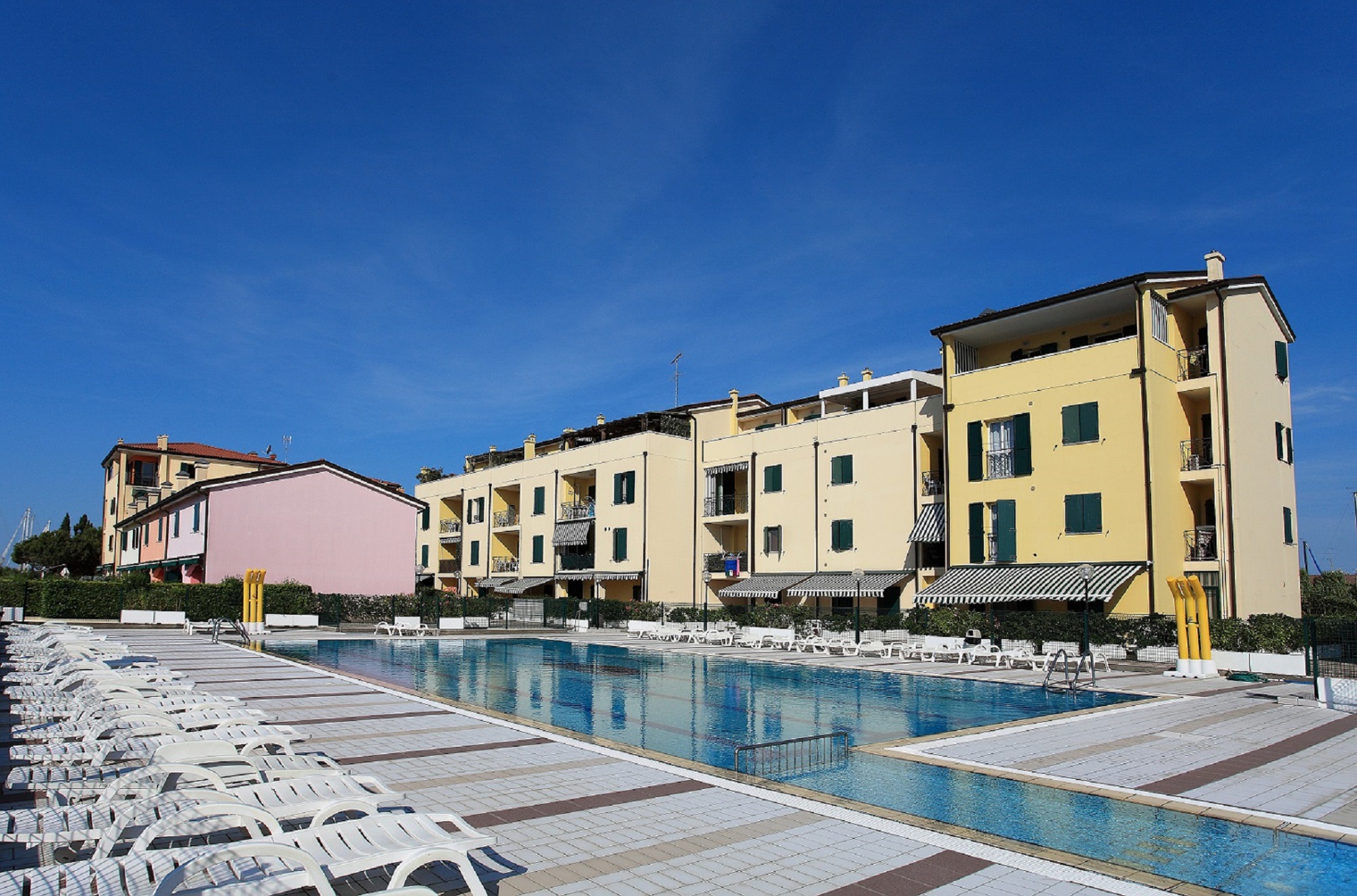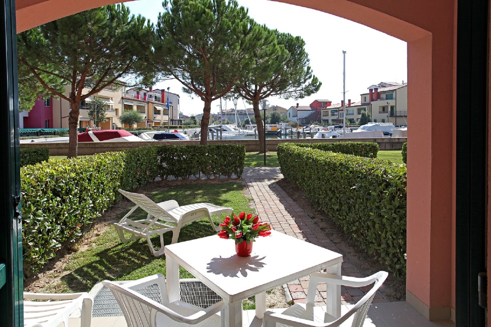 Le villette godono di esposizioni diverse: verso la piscina oppure verso il vialetto interno. Alcune unità dispongono di giardino e portico arredato, altre di solo portico, sempre attrezzato con tavolo e sedie esterne, ideale per pranzi e cene all’aperto.