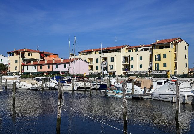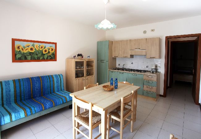 Bilocale giardino, composto da camera con letto matrimoniale e letto singolo, soggiorno con angolo cottura e divano letto doppio, bagno. ALBATROS EST è un residence con piscina ed ascensore (solo alla scala E) situato in zona "Darsena dell'Orologio", vicino al centro storico e a 800 metri dalla spiaggia. E' composto da appartamenti di varie metrature, alcuni con giardino, altri con o senza terrazzo. Ciascuno dispone di un posto auto privato.