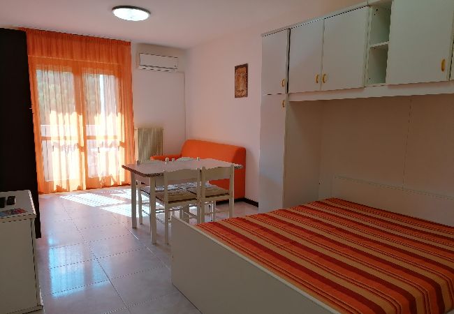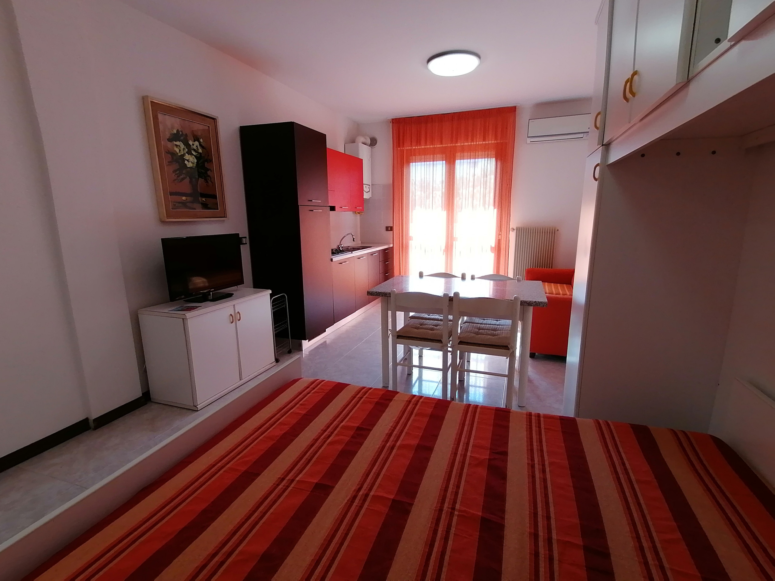 Monolocale al piano superiore con ascensore. Composto da soggiorno con quattro posti letto: due divani letto doppi o divano letto doppio e due divani letto signoli o letto matirmoniale con divano letto doppio, angolo cottura, bagno con box-doccia. Dotazioni: TV, lavatrice, aria condizionata. Posto auto privato. Appartamento si trova pochi passi dalla spiggia di Ponente, nelle vicinanze spiaggia attrezzata, spiggia libera e anche spiaggia per i cani. Piccoli negozi, fruttivendolo, gelateria, panificio e ristornati nelle immediate vicinanze.