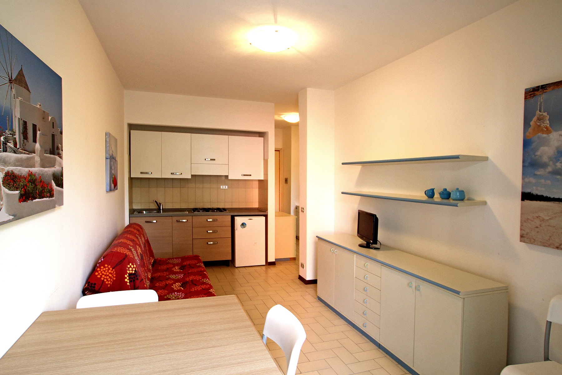 Il RESIDENCE SELENIS si trova nella tranquilla zona del "Villaggio dell'Orologio" a Caorle, a circa 150 metri dalla spiaggia, e gode di un ampio parco condominiale attorno alla piscina. Negozi e ristoranti nelle vicinanze.Bilocale al primo piano con terrazzo sul retro, composto da una camera matrimoniale, soggiorno con angolo cottura e divano letto doppio, bagno con vasca. Dotazioni: TV e aria condizionata. Posto auto privato scoperto.