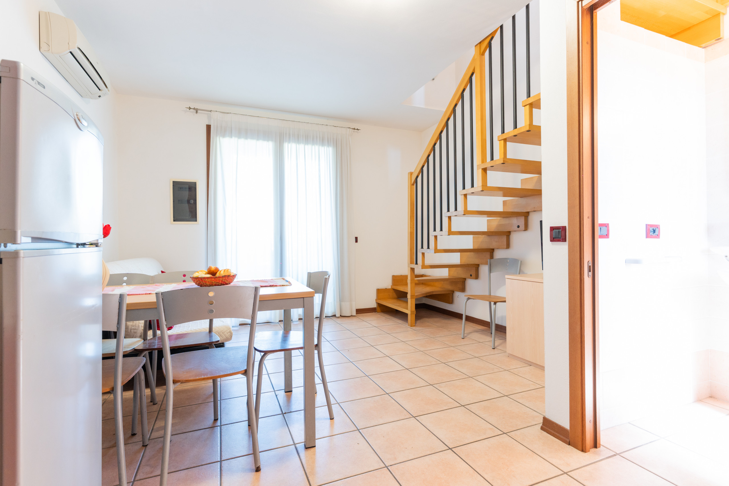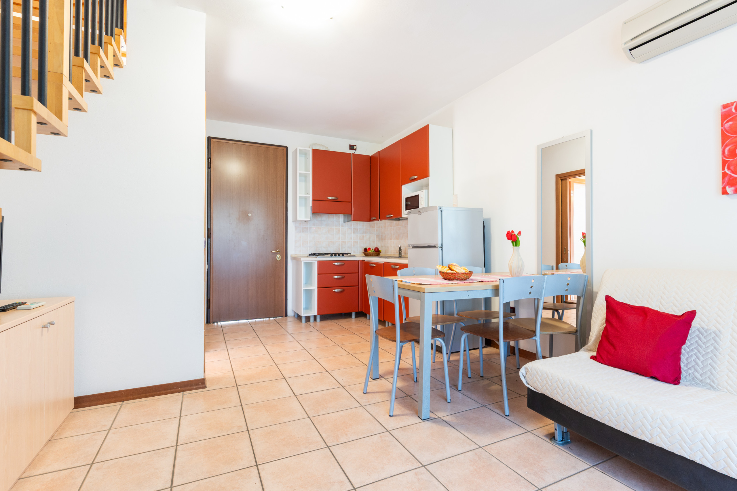 - Piano terra: zona living con angolo cottura accessoriato, tavolo con sedie e un comodo divano letto matrimoniale alla francese; bagno di servizio con finestra.