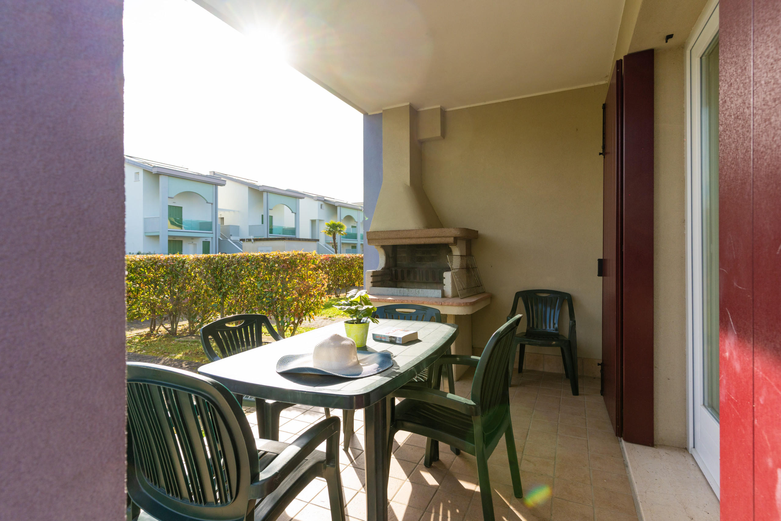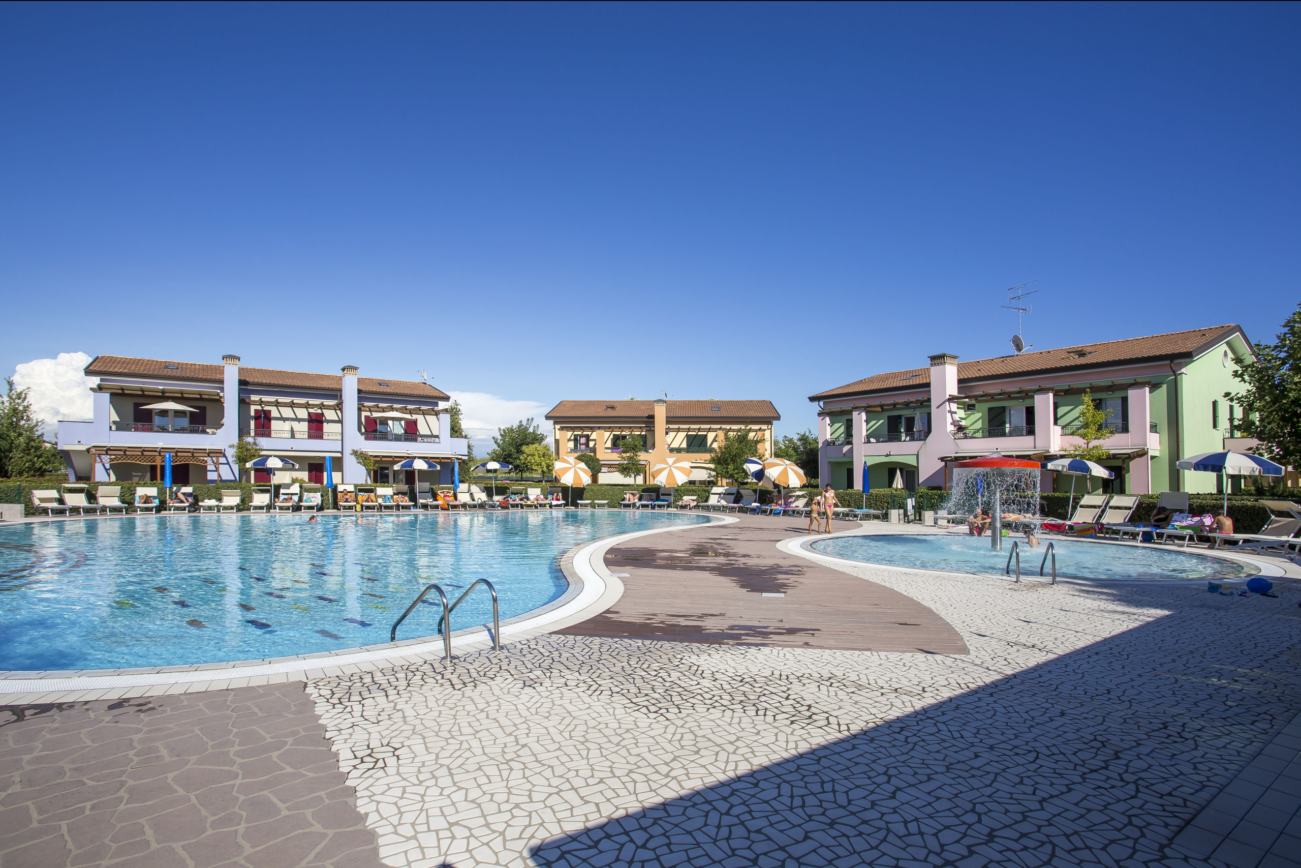 Le villette godono di esposizioni diverse: verso la piscina oppure verso il vialetto interno. Alcune unità dispongono di giardino e portico arredato, altre di solo portico, sempre attrezzato con tavolo e sedie esterne, ideale per pranzi e cene all’aperto.