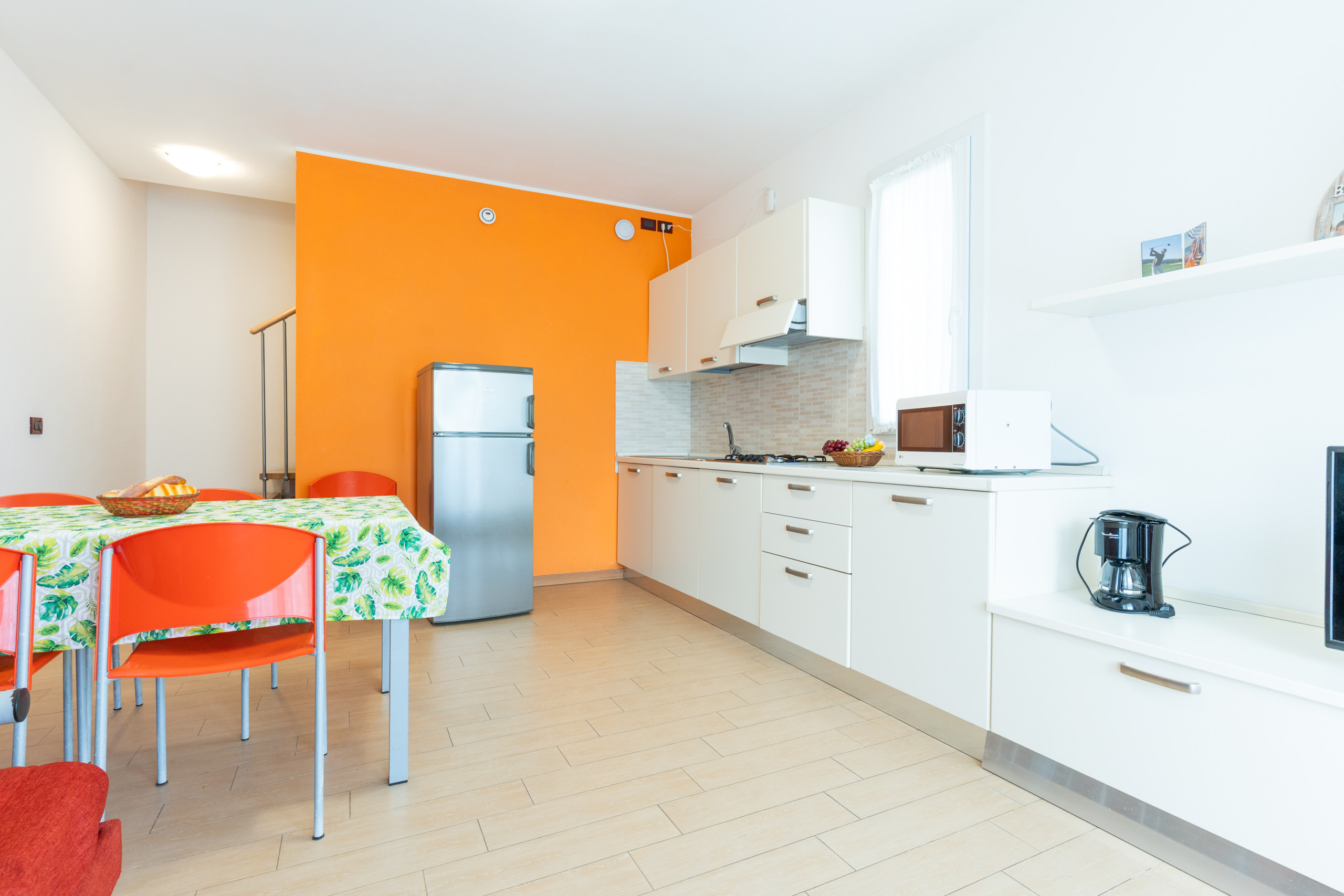 Ogni villetta (45 mq) è disposta su due piani: al piano terra troviamo un soggiorno con angolo cottura e un comodo divano letto matrimoniale alla francese;