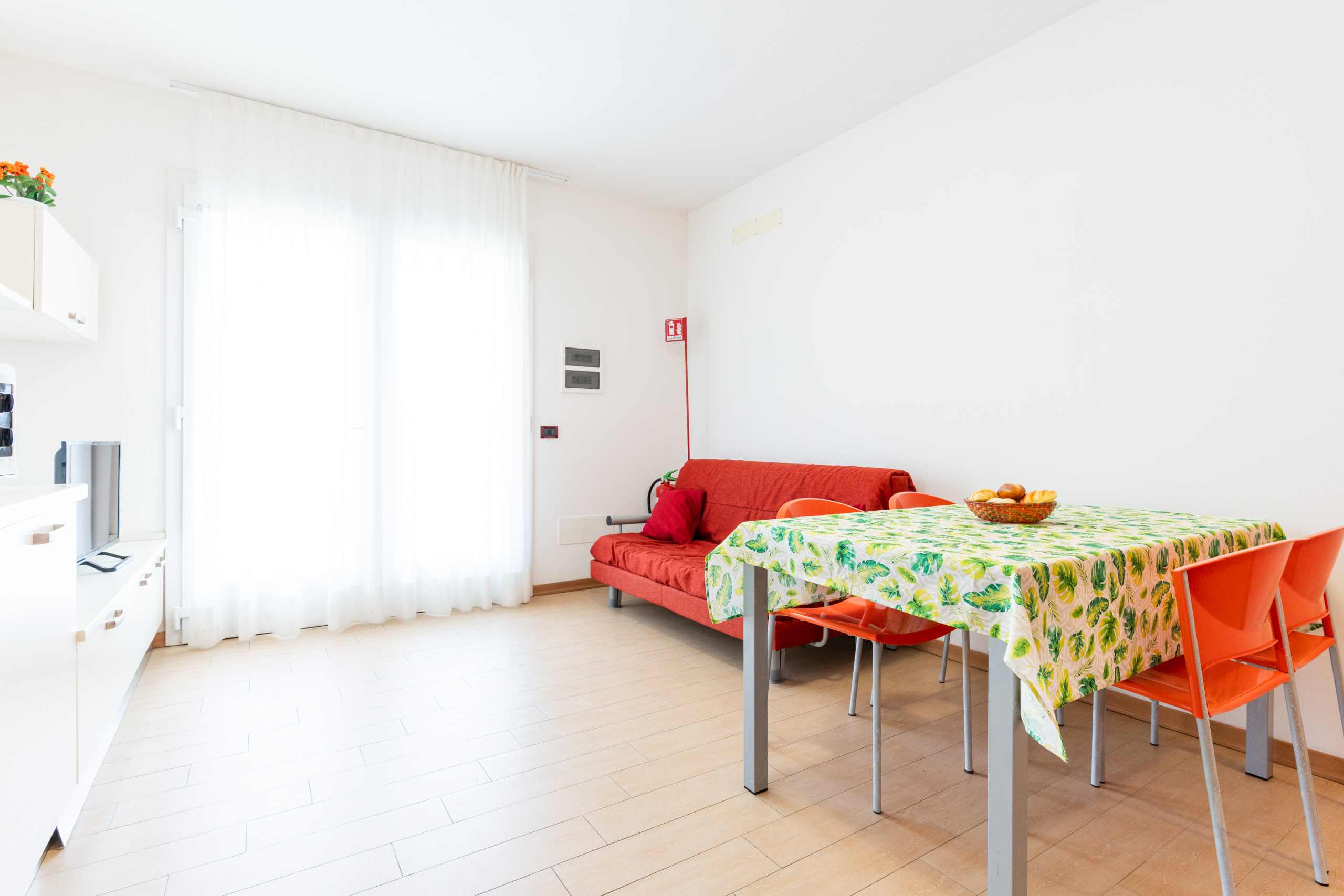 Al piano terra: un giardino privato (senza vista piscina) perfetto per pranzi o momenti di relax, e un soggiorno luminoso con angolo cottura attrezzato e divano letto matrimoniale.