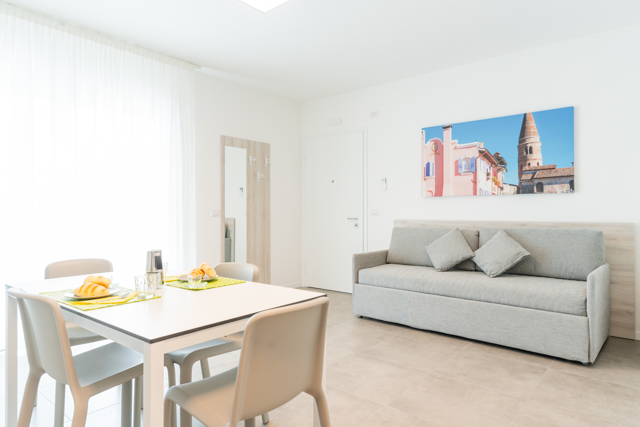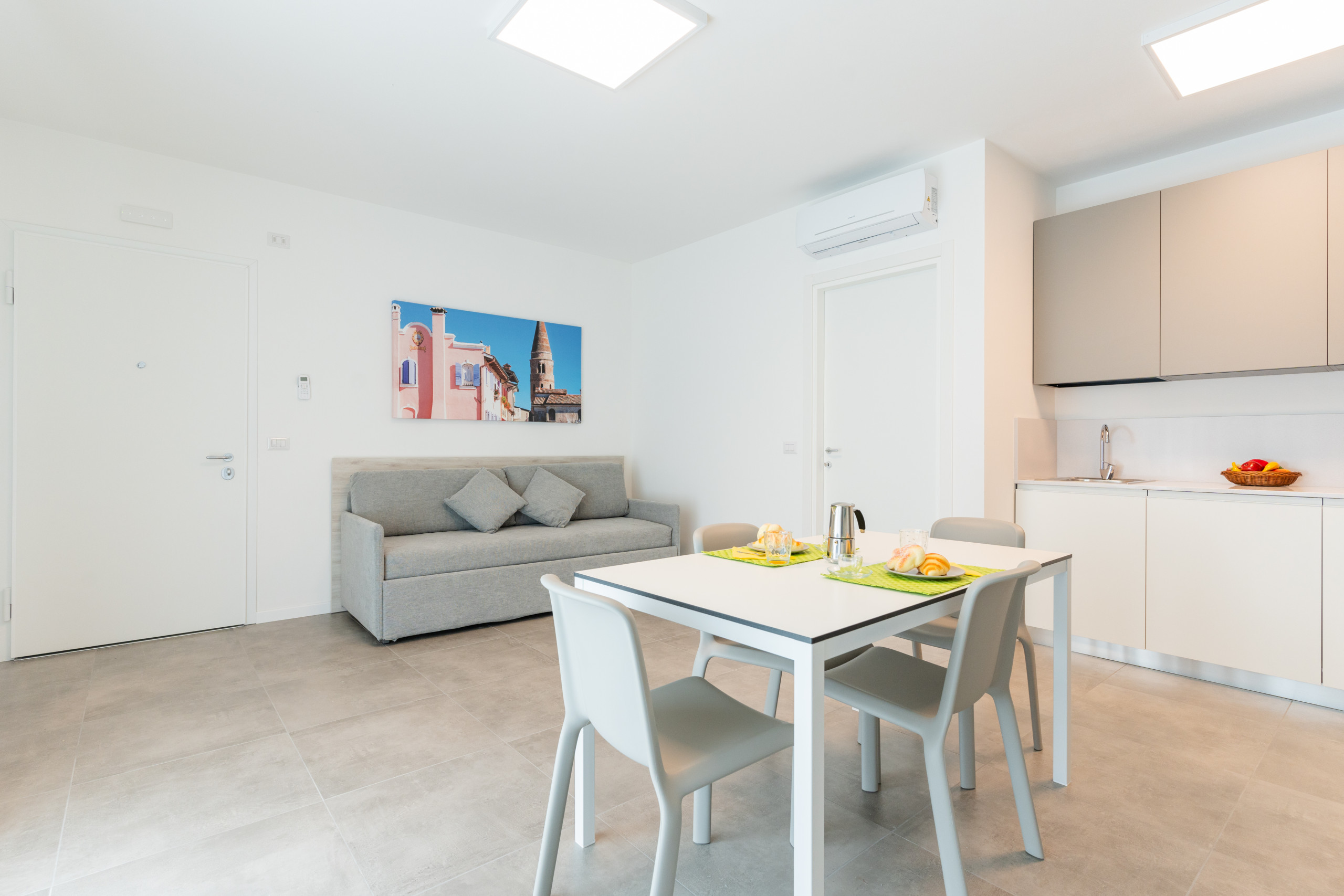 Gli appartamenti bilocali al piano terra (55 mq) sono perfetti per ospitare fino a 5 persone. Hanno tutti un giardinetto privato arredato con tavolo e sedie e si affacciano sulla piscina, sul viale o sull’area parcheggio. Dentro troverai spazi comodi e ben organizzati: soggiorno con angolo cottura e divano letto matrimoniale alla francese, una camera con letto matrimoniale più un letto singolo, bagno con box doccia e tutti i comfort di cui hai bisogno.