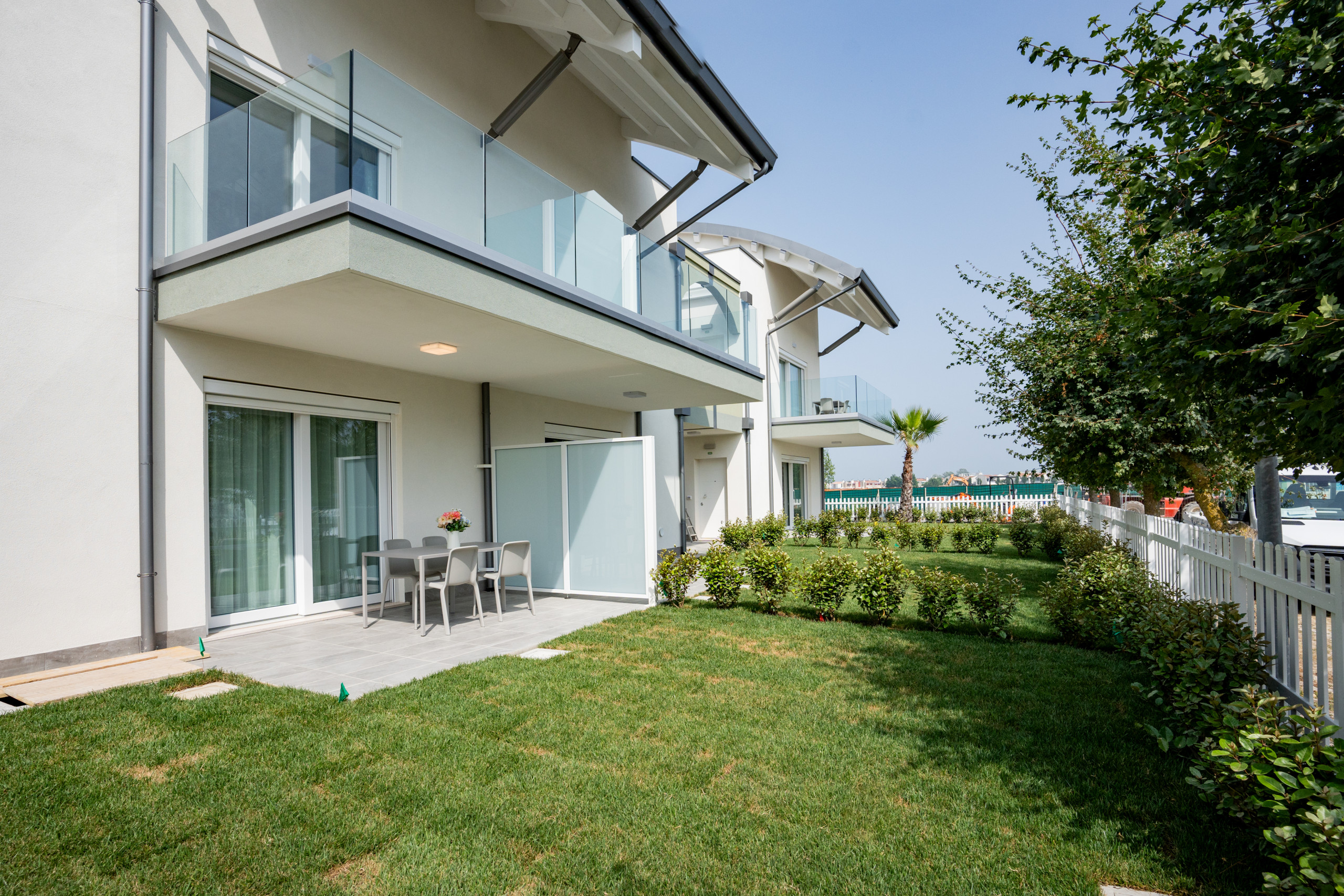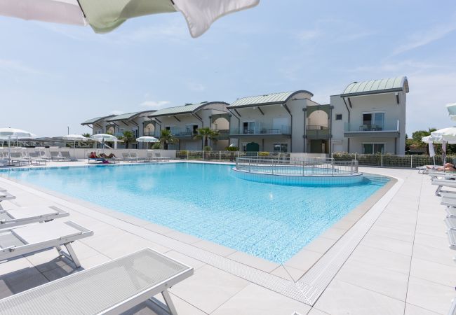 Le villette godono di esposizioni diverse: verso la piscina oppure verso il vialetto interno. Alcune unità dispongono di giardino e portico arredato, altre di solo portico, sempre attrezzato con tavolo e sedie esterne, ideale per pranzi e cene all’aperto.