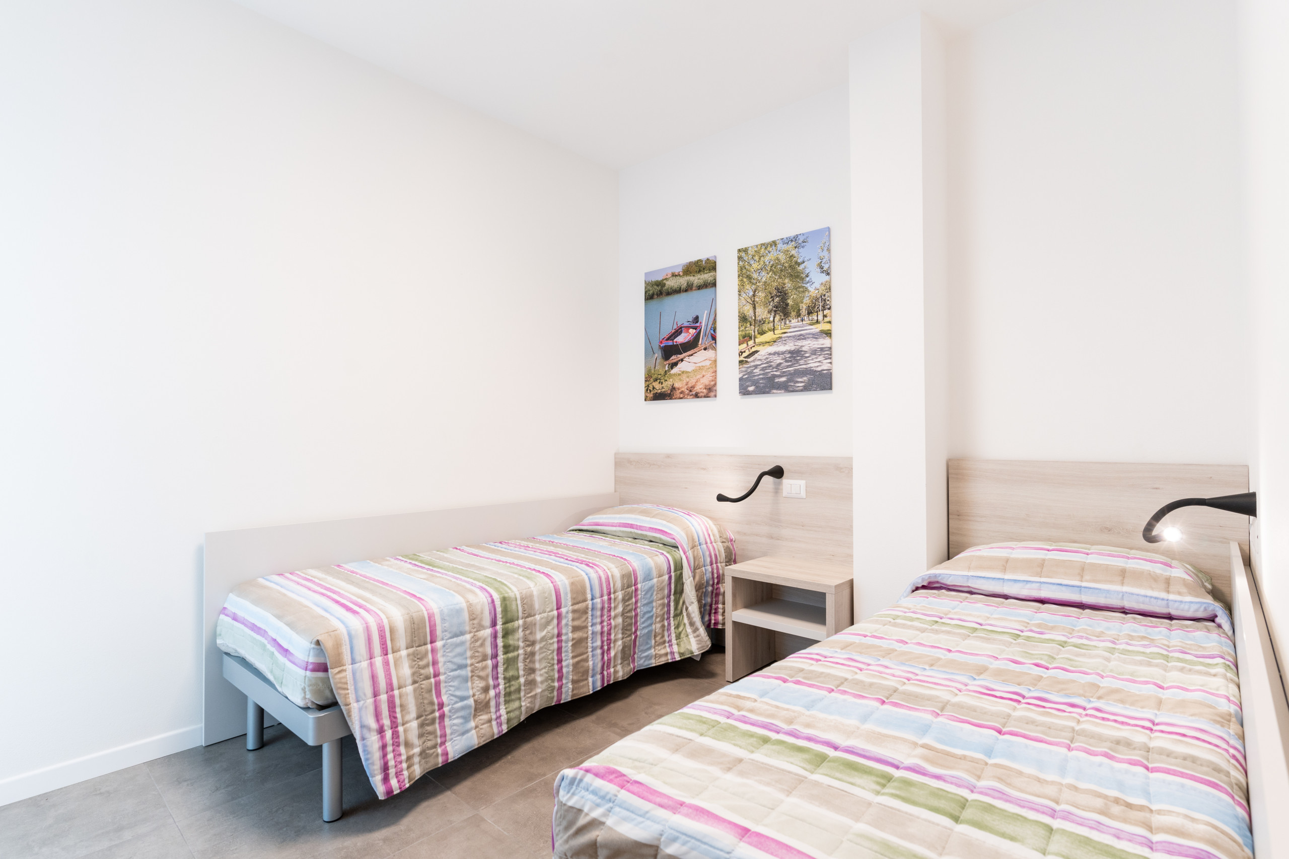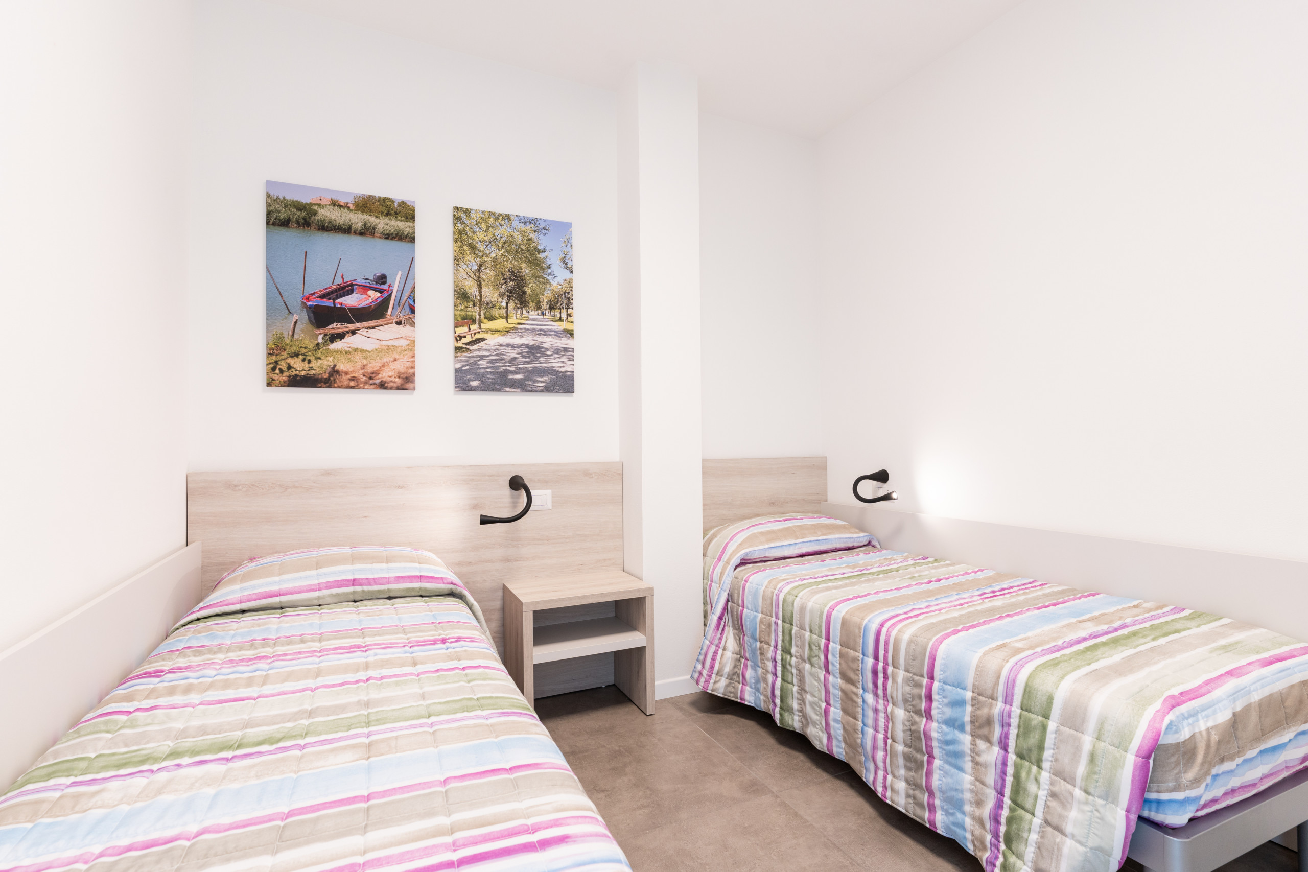 Tutti gli appartamenti si sviluppano su un unico livello e alcuni offrono la vista sulla piscina e altri con vista lateralmente. Il soggiorno dispone di angolo cottura attrezzato, tavolo, sedie e divano letto matrimoniale alla francese, con accesso al balcone o al giardino, ideale per pranzi e cene all’aperto. La camera principale è arredata con letto matrimoniale e letto singolo, mentre la seconda camera offre due letti singoli. Il bagno è spazioso e dotato di box doccia.