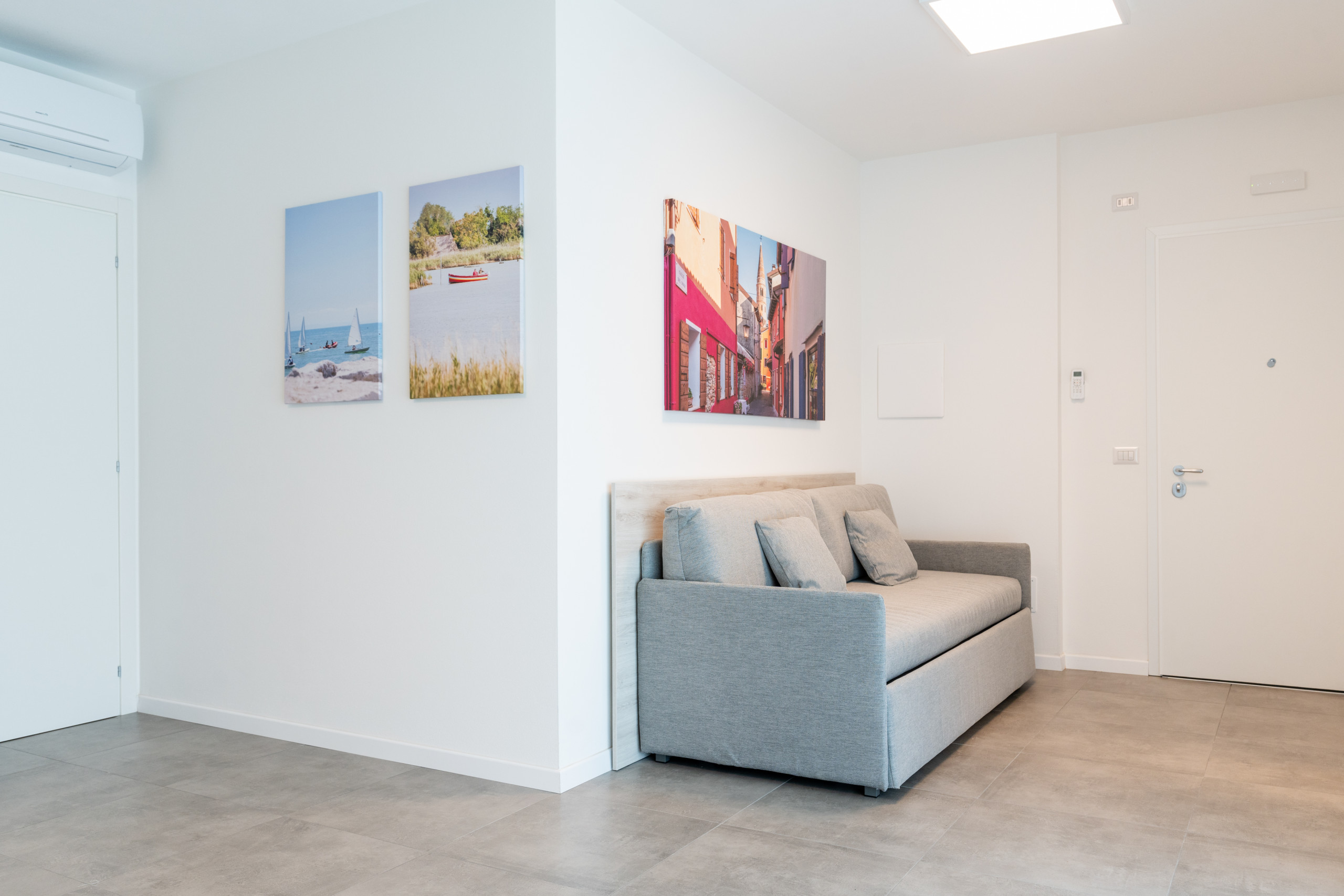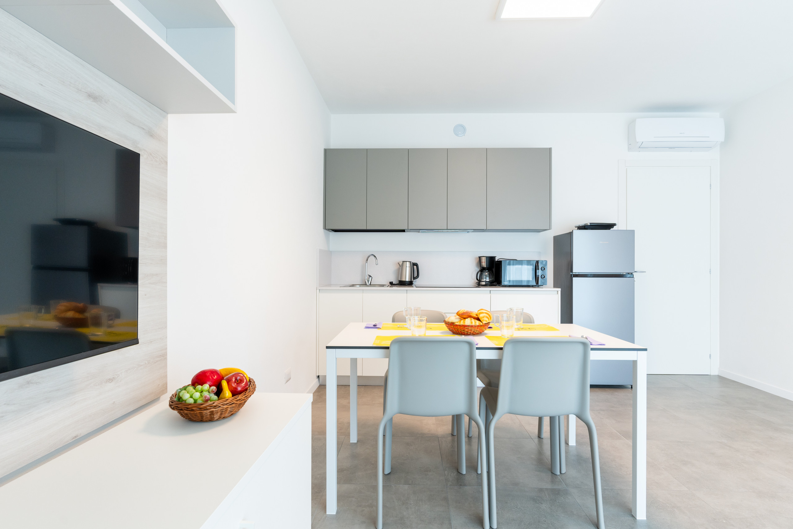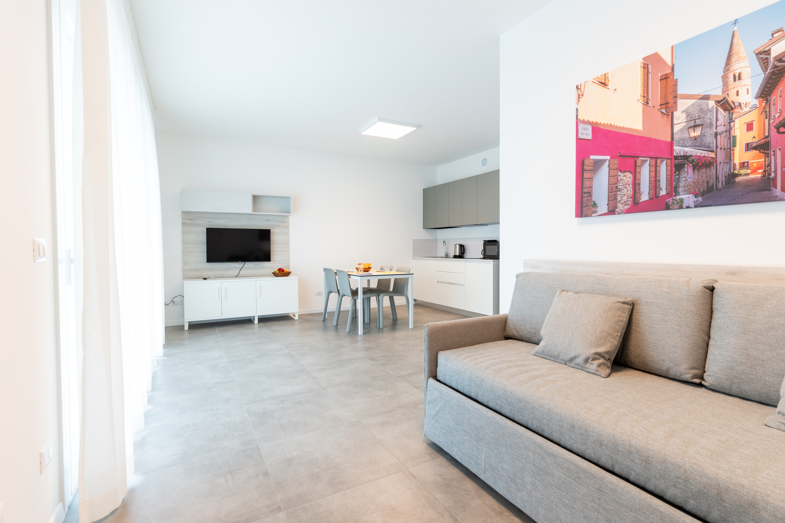• soggiorno luminoso con angolo cottura attrezzato, tavolo da pranzo, divano letto matrimoniale alla francese e accesso a terrazzo o balcone;